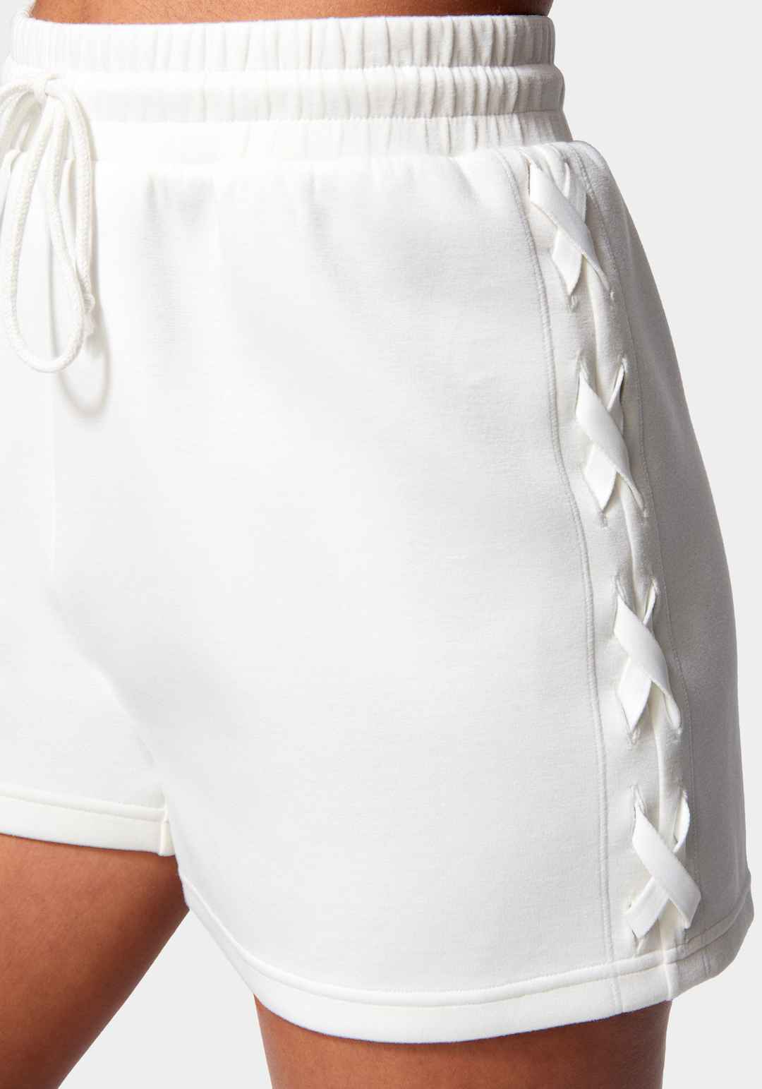 Soft and sleek, these scuba knit shorts feature a lace-up detail along the sides, an elasticized drawstring waist, and a relaxed fit. Pair with the Scuba Lace-Up Sleeve Detail Hoodie for a matching look. 55% Rayon, 40% Polyeste, 5% Spandex Hand wash. Hang to dry. Imported 3" Inseam | Bebe Women's Sc...more