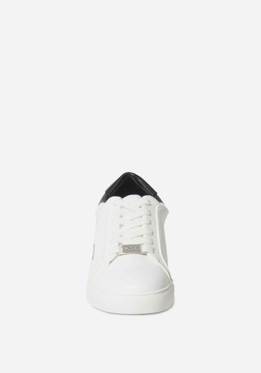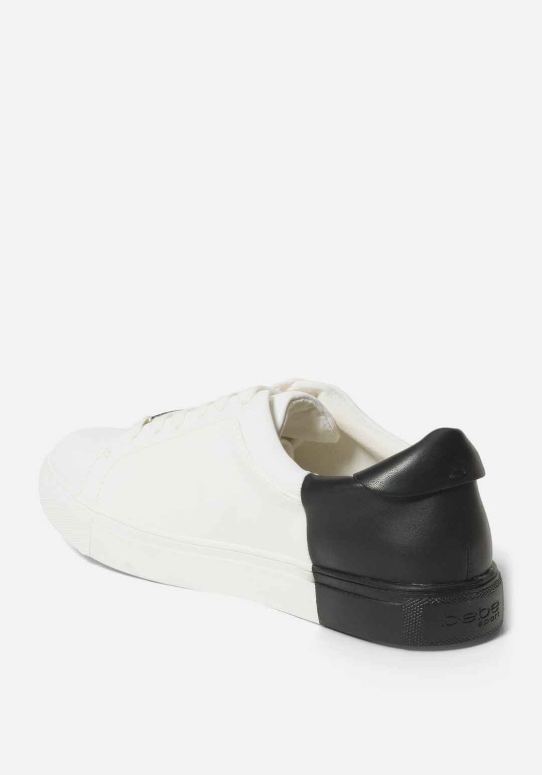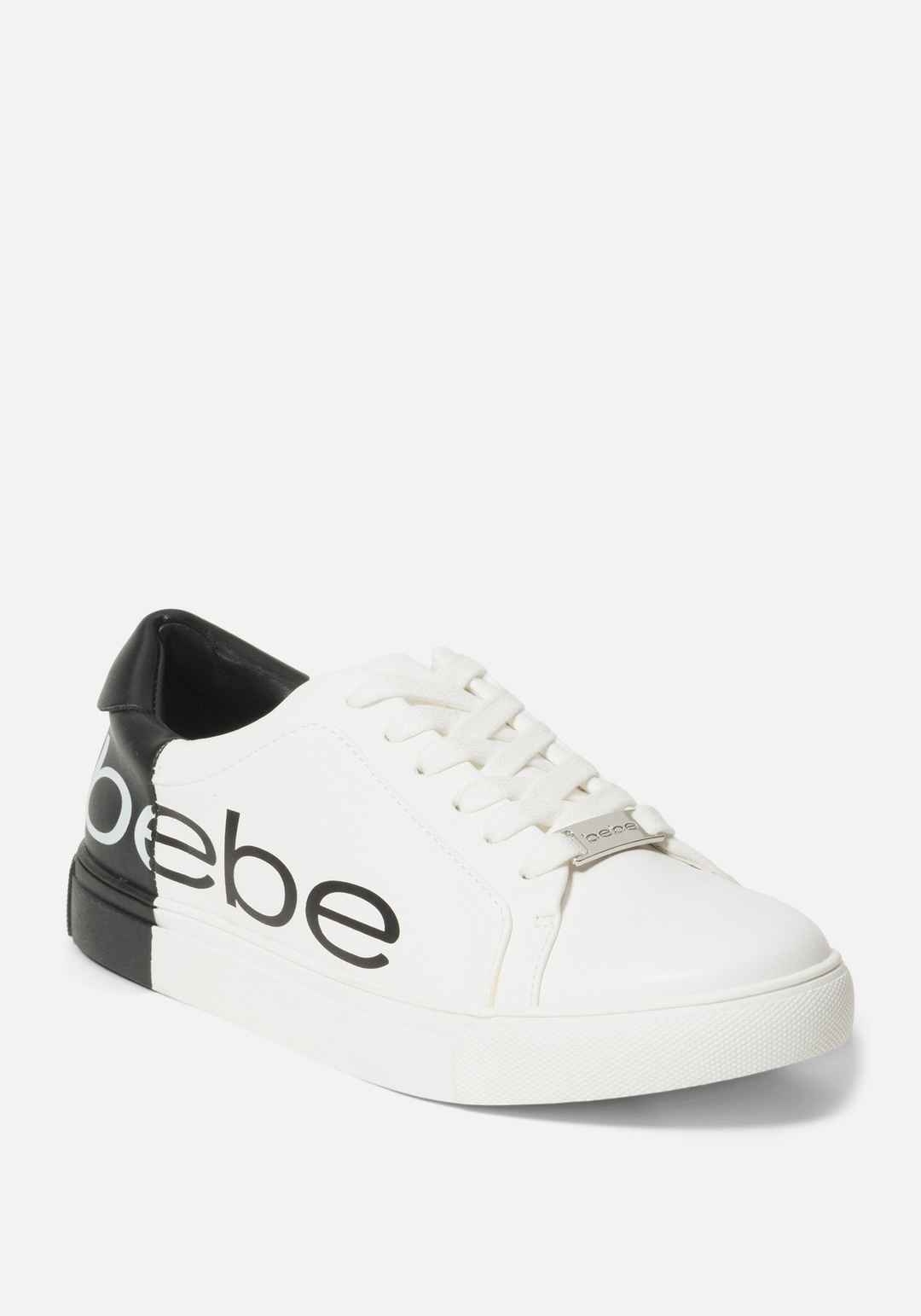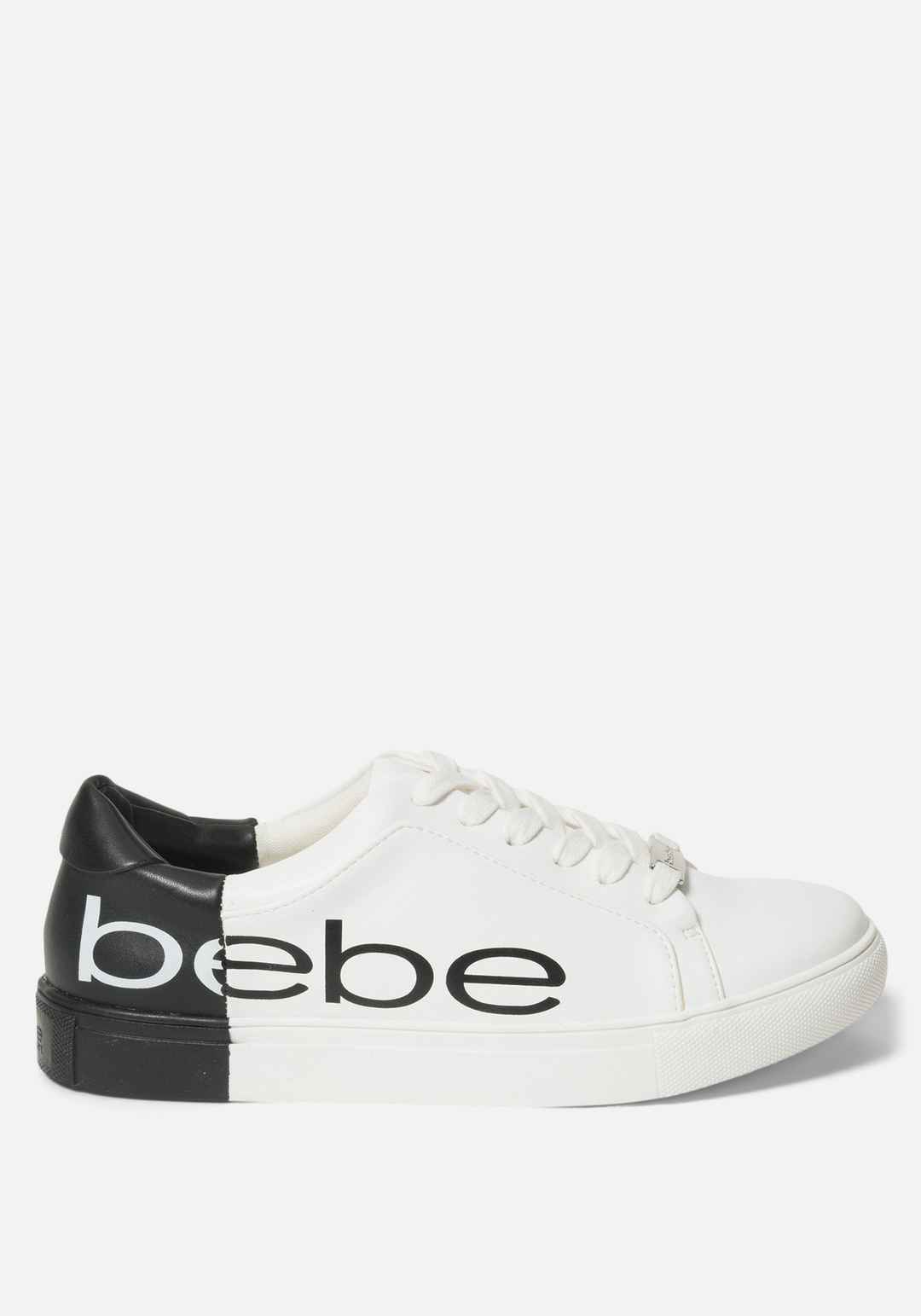 Chic and casual low-top, lace-up sneaker. Featuring a bold color-block design and Bebe logo. 100% Synthetic 1" Heel Spot Clean Only Imported | Women's Charley Bebe Logo Sneakers, Size 10 in White/Black Synthetic