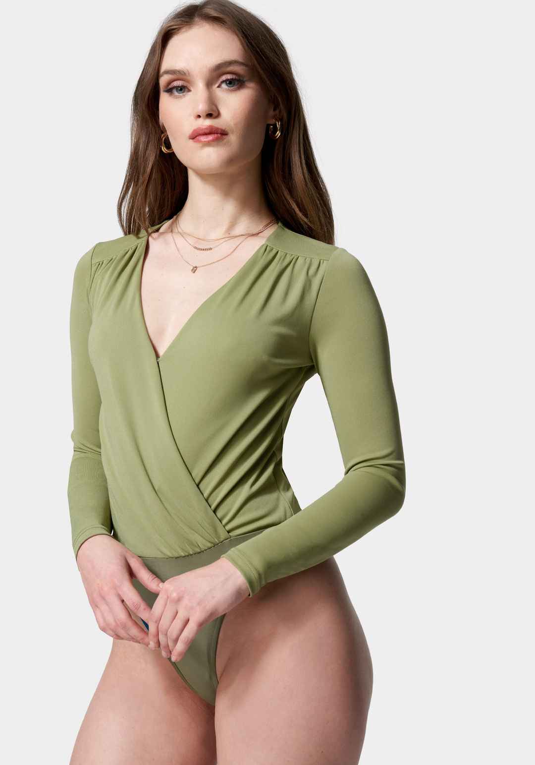 The perfect top under your pants and skirts, this sleek bodysuit features a wrap front design and long sleeves for that effortless polish. 95% Polyester 5% Spandex Hand Wash, Hang To Dry Imported | Bebe Women's Wrap Front Knit Bodysuit, Size Small in Sage Spandex
