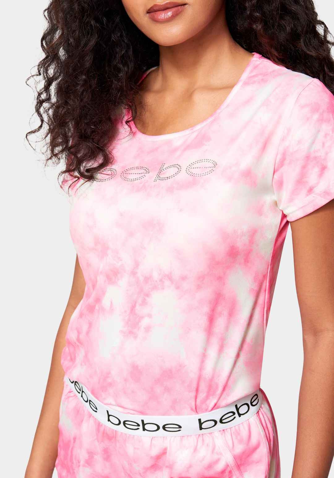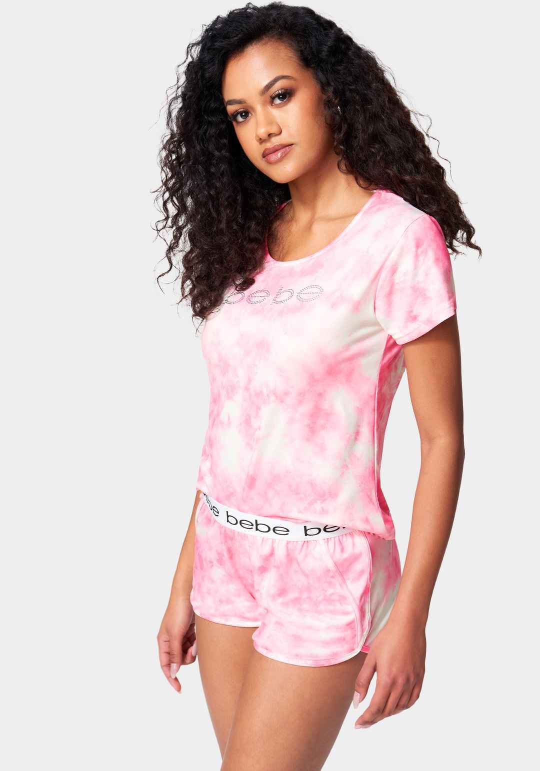 Sleep in style and comfort in the Bebe Printed Short Set. Features a scoop neck top with matching shorts, adorned with our signature Bebe logo in crystal embellishments. 95% Polyester, 5% Spandex Hand wash cold Imported | Women's Bebe Printed Short Set, Size Large in Light Pink Spandex