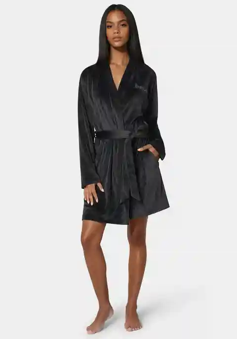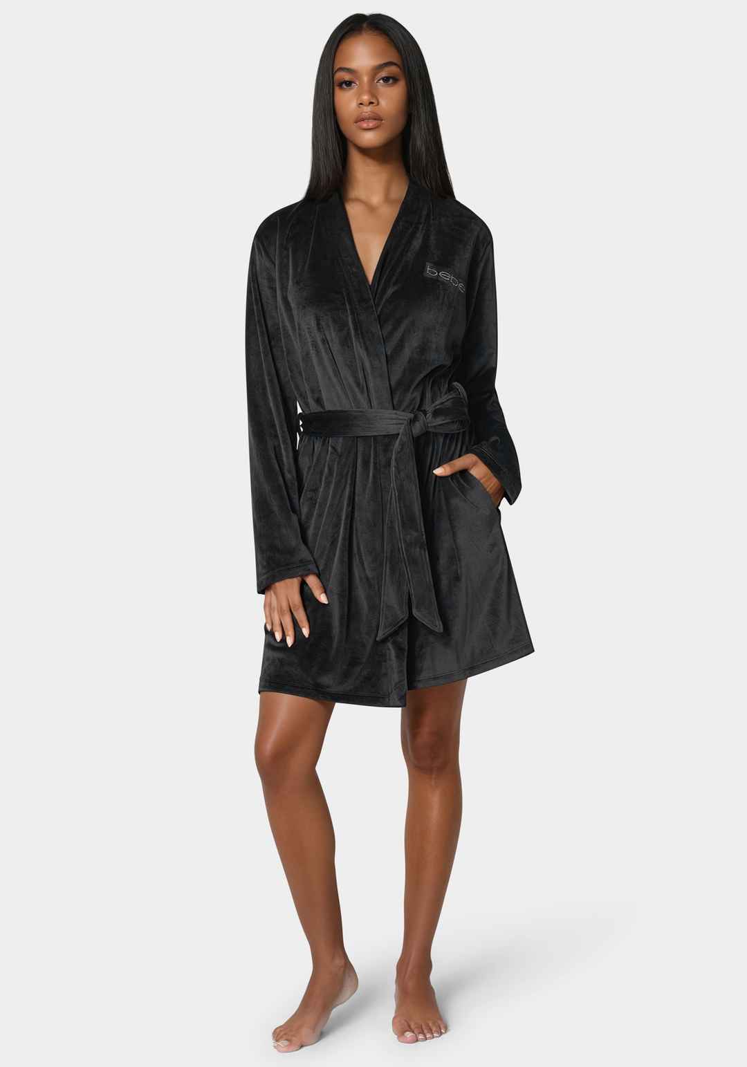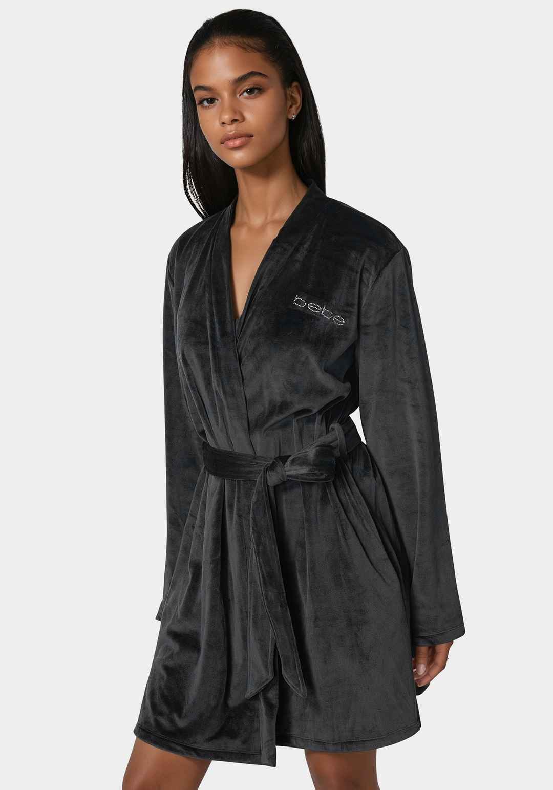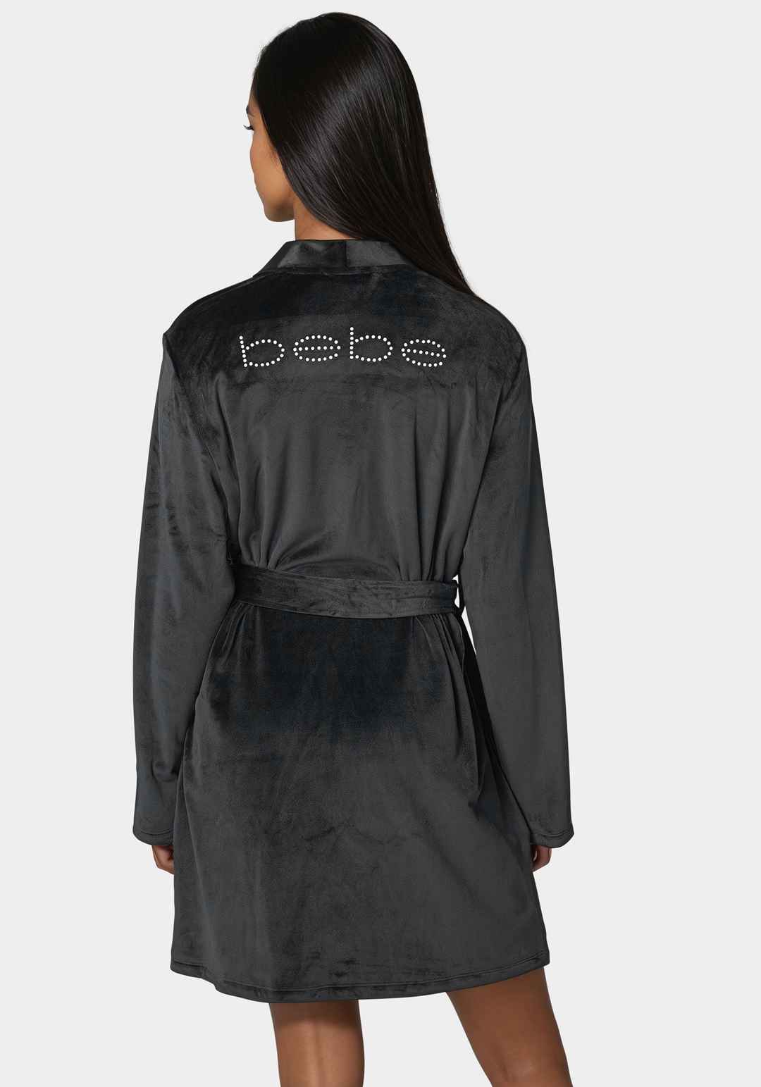 Elevate your relaxation routine in a velour robe, featuring the bebe logo outlined in trending pearl studs. Material & Care: 95% Polyester 5% Spandex Machine Wash Cold With Like Colors. Do Not Bleach. Tumble Dry Low. Delicate Gentle Cycle. Do Not Iron. Imported | Bebe Women's Velour Robe W/ Pearl St...more