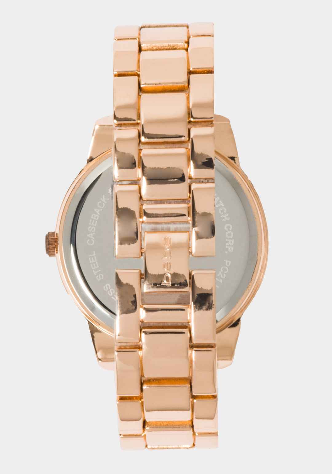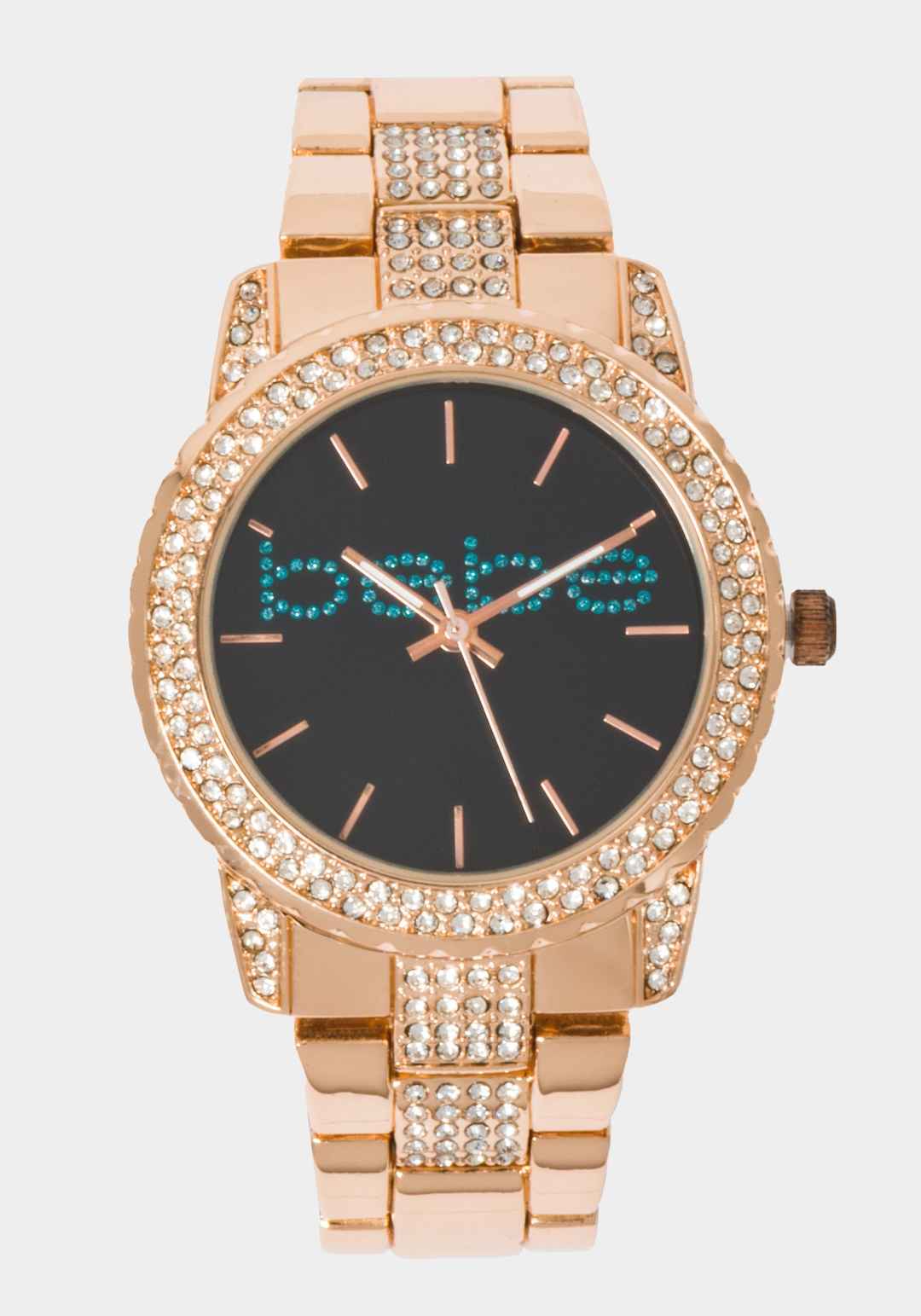 Make a bold statement with this Black Smooth Dial Crystal Bezel Watch. Featured in rose gold, complete with crystals on the bezel, crystal logo on the face, and clear pav crystals along the chain and lug ends. Spot clean Imported | Bebe Women's Black Smooth Dial Crystal Bezel Watch in Rose Gold
