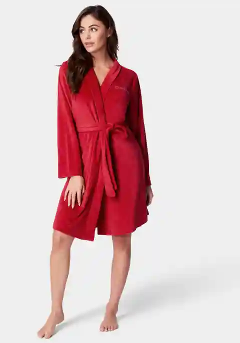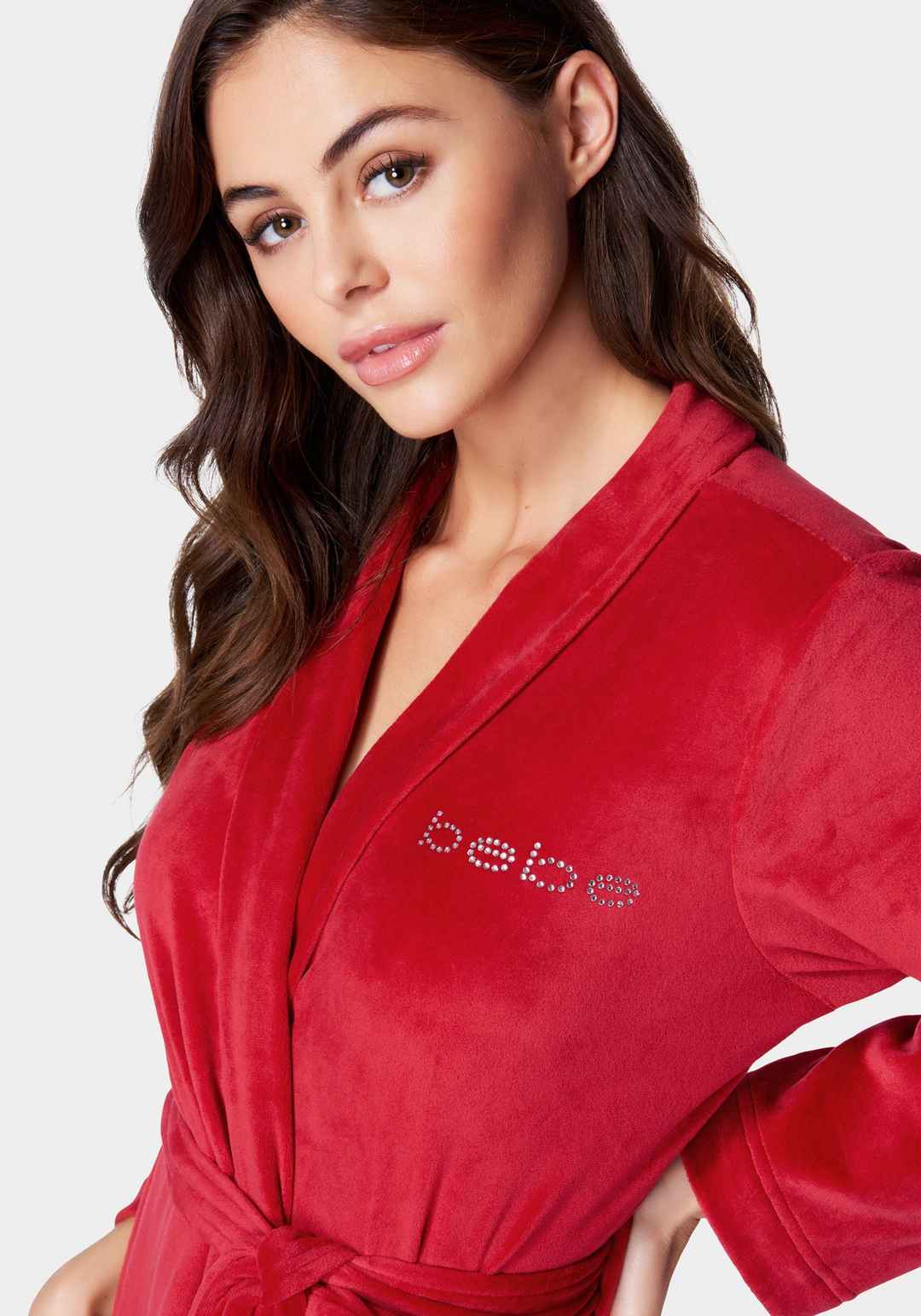 Feel like royalty in a striking red velour robe adorned with sparkling rhinestones, offering both charm and warmth. 100% Polyester Hand wash cold, line dry Imported | Bebe Women's Velour with Rhinestones Robe, Size Small in Red Polyester
