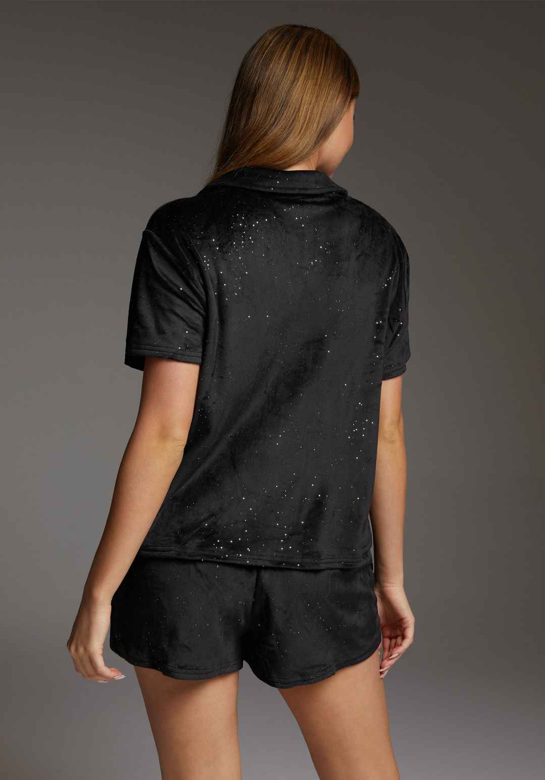 Slip into comfort with this notch short-sleeve set. Perfect for lounging in style. Material & Care: 95% Polyester 5% Spandex Machine Wash Cold With Like Colors. Do Not Bleach. Tumble Dry Low. Delicate Gentle Cycle. Do Not Iron. Imported | Bebe Women's Mirror Paper Notch Short Sleeve Set, Size Medium...more