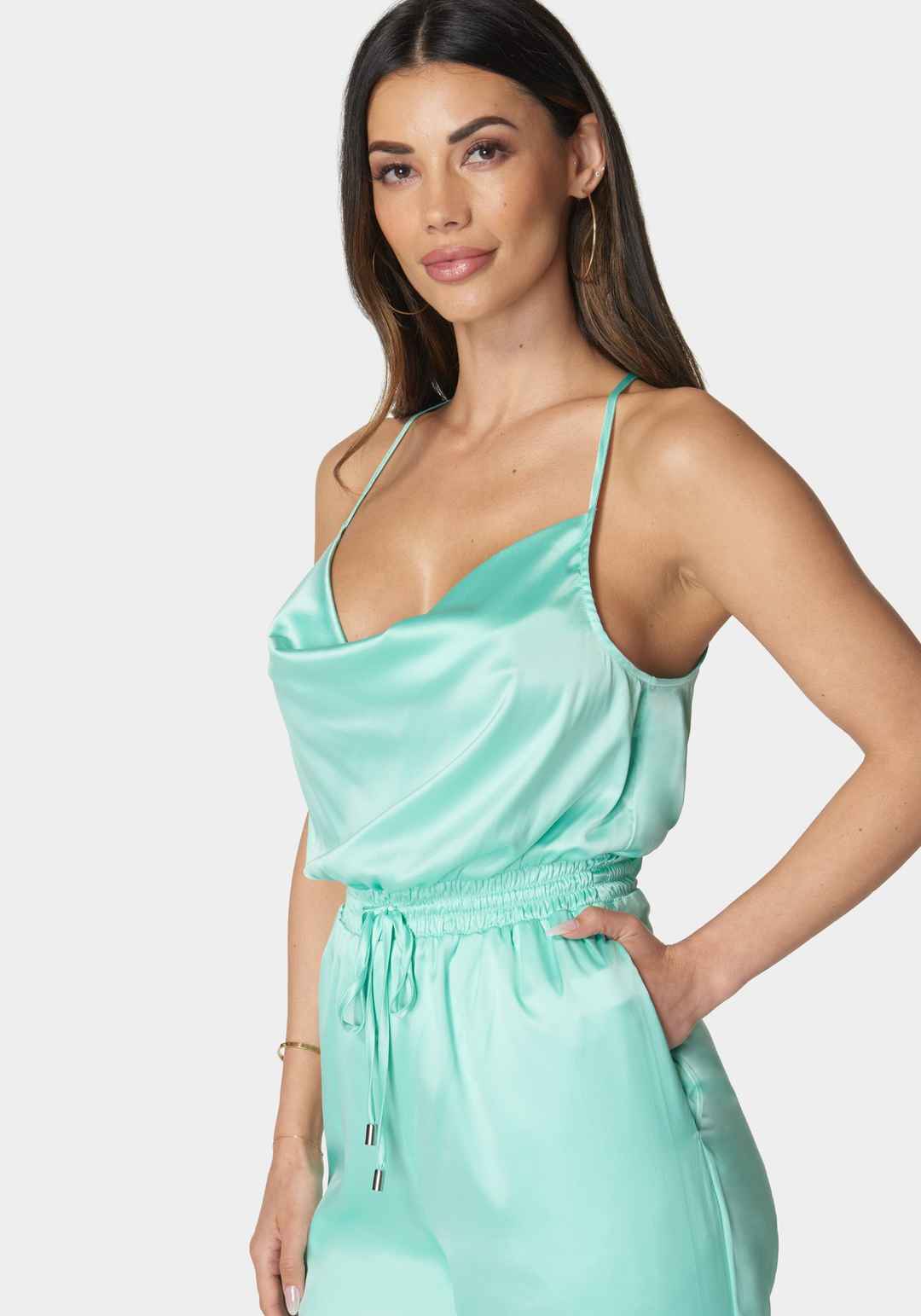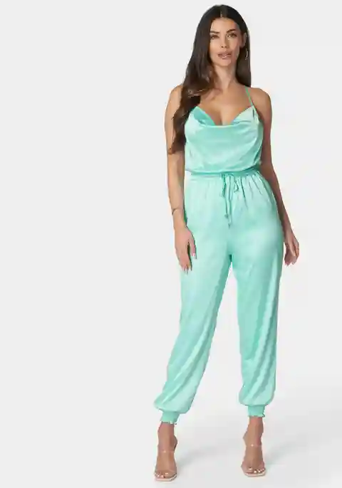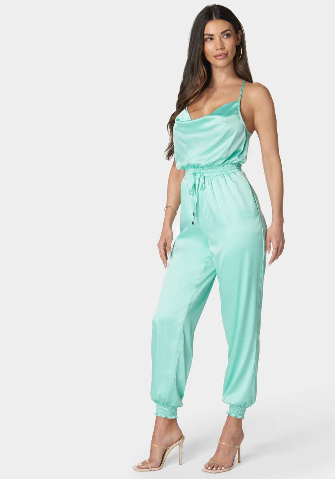 A flattering cowl neckline and cinched waist elevate a day-to-night jumpsuit. Pair with your favorite bebe heels to complete the look. 96% Polyester, 4% Spandex; Lining:97% Polyester, 3% Spandex Hand wash cold separately. Do not bleach. Dry flat. Cool iron if needed. Imported 28.25" Inseam | Bebe Wo...more
