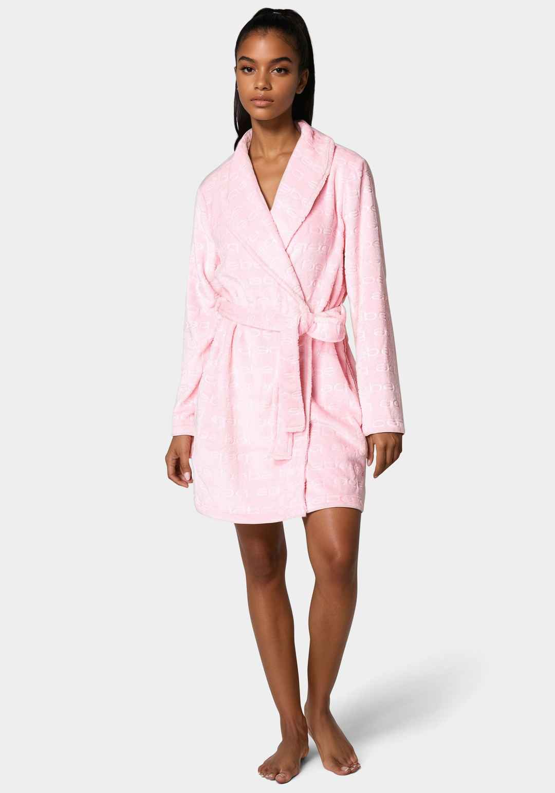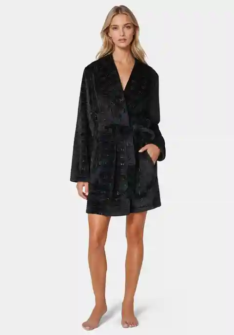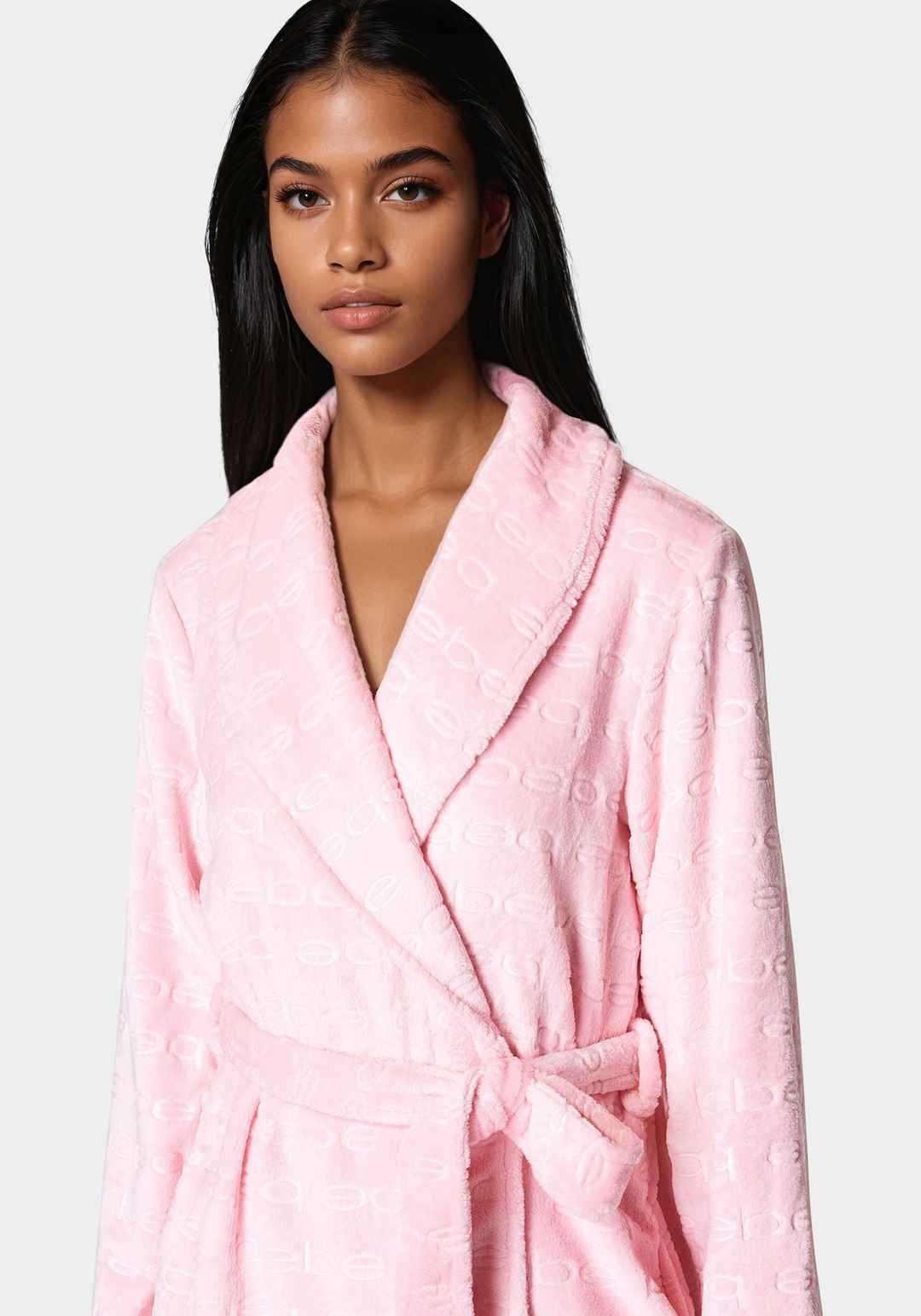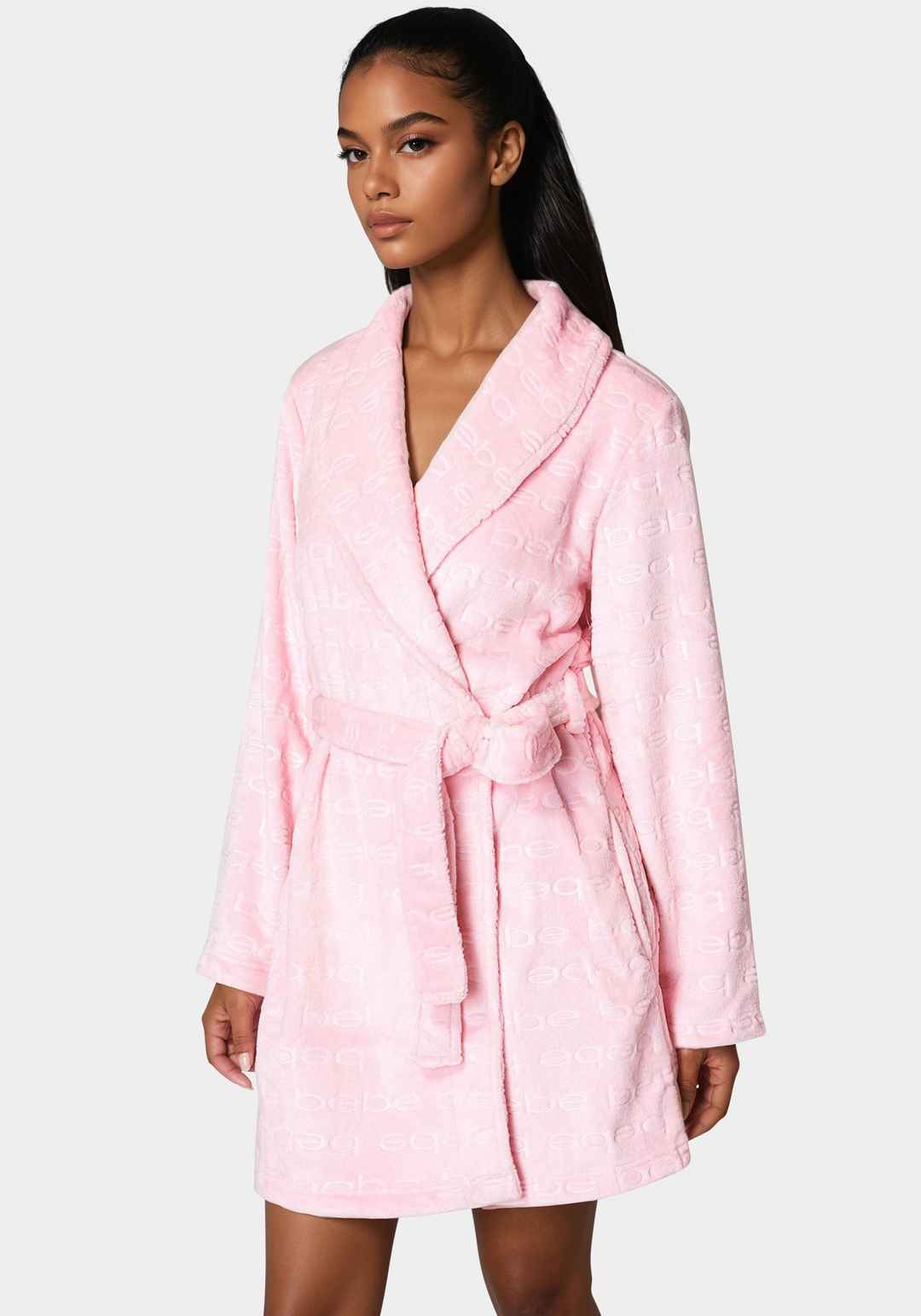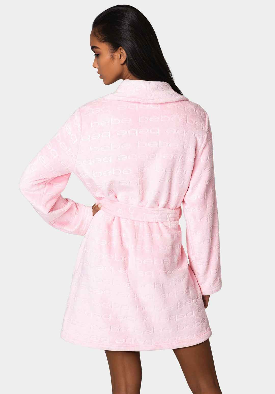 Indulge in the ultimate comfort with our debossed plush robe. An ultra cozy robe that allows you to unwind in iconic bebe style. Material & Care: 100% Polyester Machine Wash Cold With Like Colors. Do Not Bleach. Tumble Dry Low. Delicate Gentle Cycle. Do Not Iron. Imported | Bebe Women's Debossed Plu...more