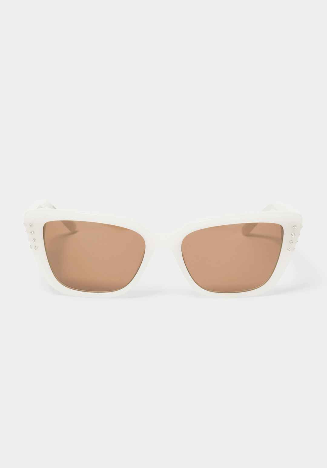 Serving Ciaras signature style, this uplifting silhouette is sculpted in milky white handmade acetate accented with rose-gold gemstone crystals. Size: Eye Size 55mm. Bridge Width 17mm. Temple/Arm Length 135mm Care Instructions: Use lens spray or a mild liquid soap/water and wipe with a clean, soft, ...more