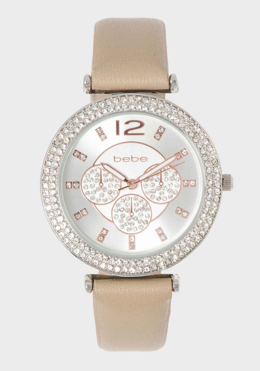 Fashion meets function in this sleek black and gold crystal bezel watch. The smooth vegan leather strap has the perfect wrist feel and feels right on trend for every occasion this season. Alloy case, PU leather strap, brass dial Wipe clean Imported | Bebe Women's Taupe & Silver Crystal Bezel Watch L...more
