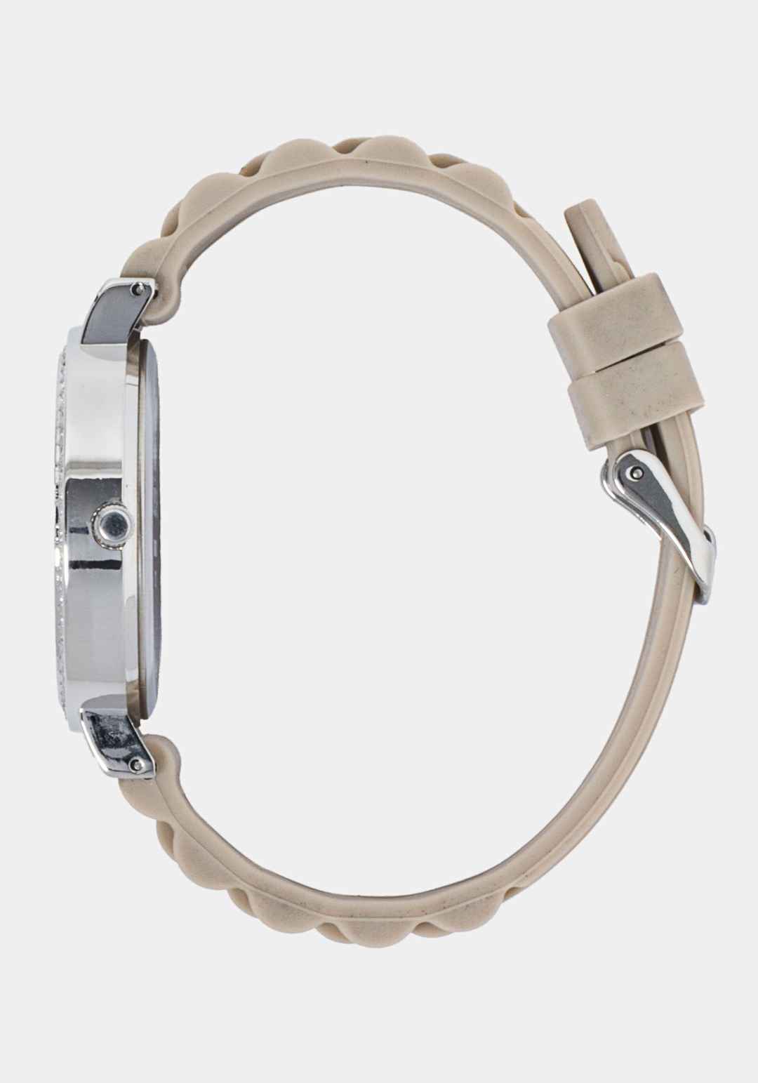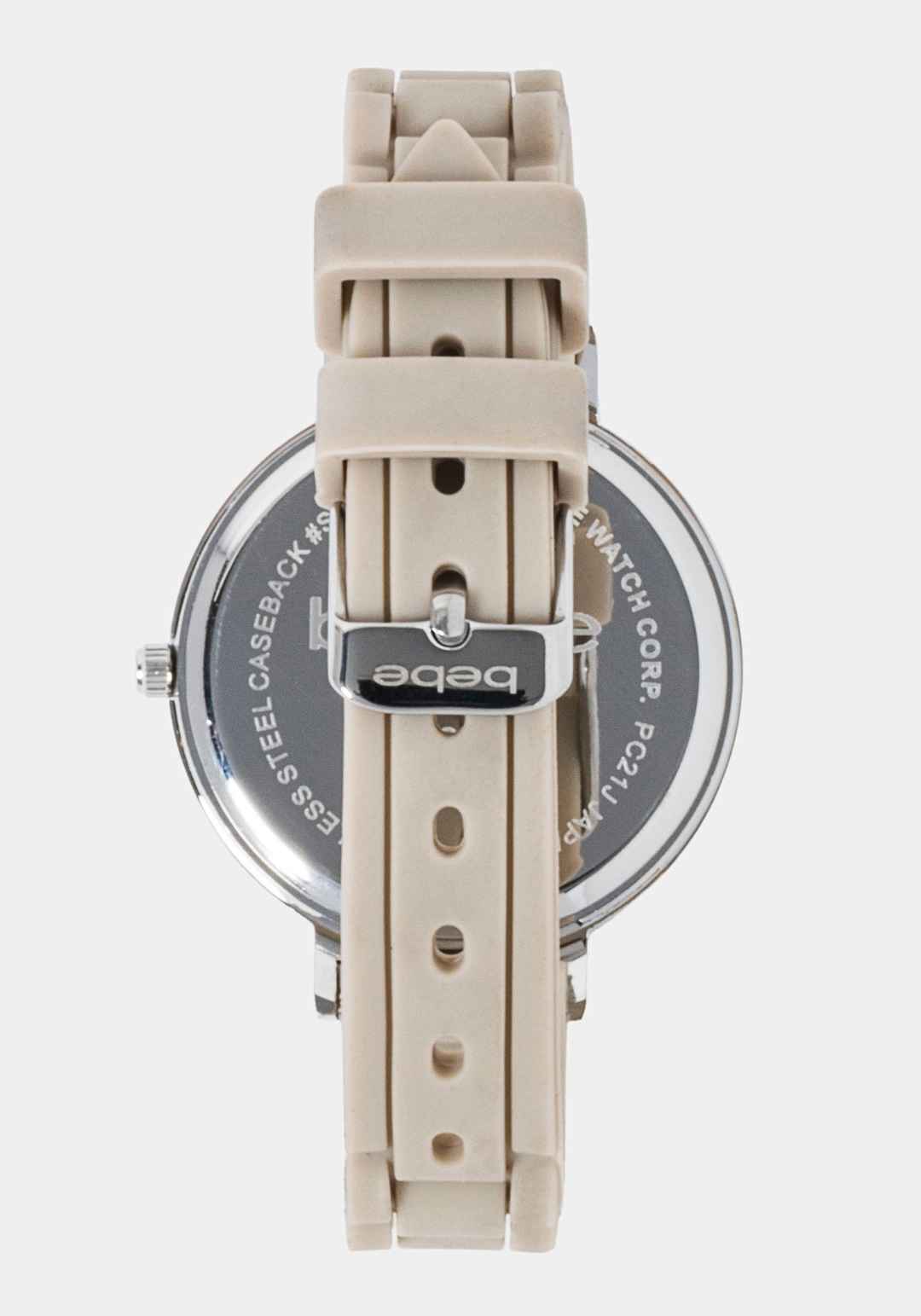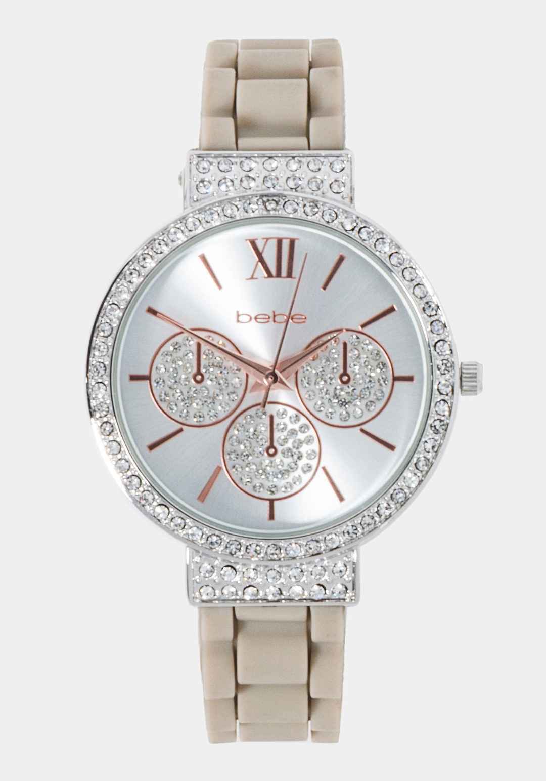 A dainty shape define this elegant day-to-night watch featuring a square design, crystals on the bezel, a taupe link strap. Case: Alloy; Caseback: Stainless Steel; Crystal: China; Movement: Japanese Strap: Silicon Spot clean Imported | Bebe Women's Taupe Crystal Bezel Roman Numeral Watch in Silverto...more
