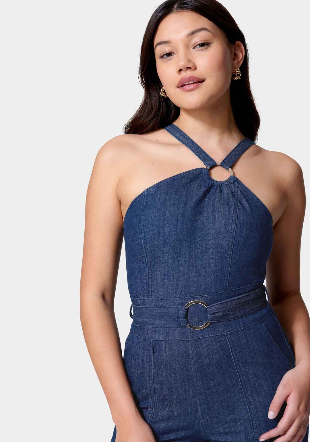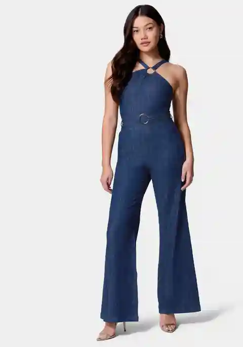 Modern and chic, this jumpsuit is a fashionable take on denim. The halter neckline, wide legs, and belted waist bring easy day-to-evening style to your wardrobe while the classic color is always in season. 98% Cotton, 2% Spandex Machine wash in delicate cycle. Imported 33" Length | Bebe Women's Asym...more