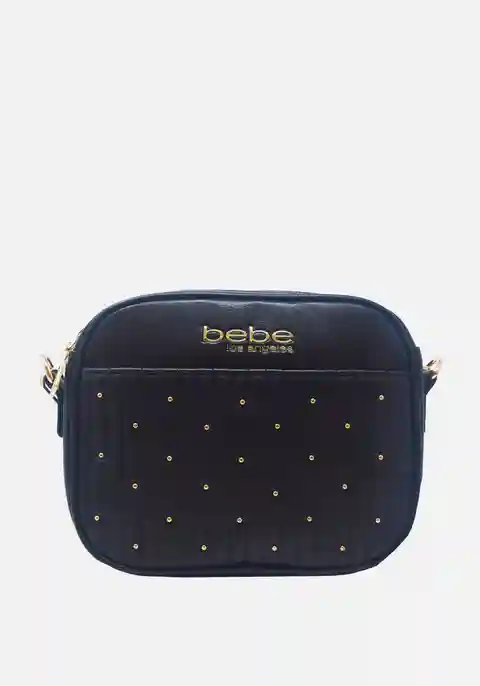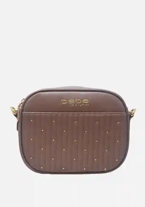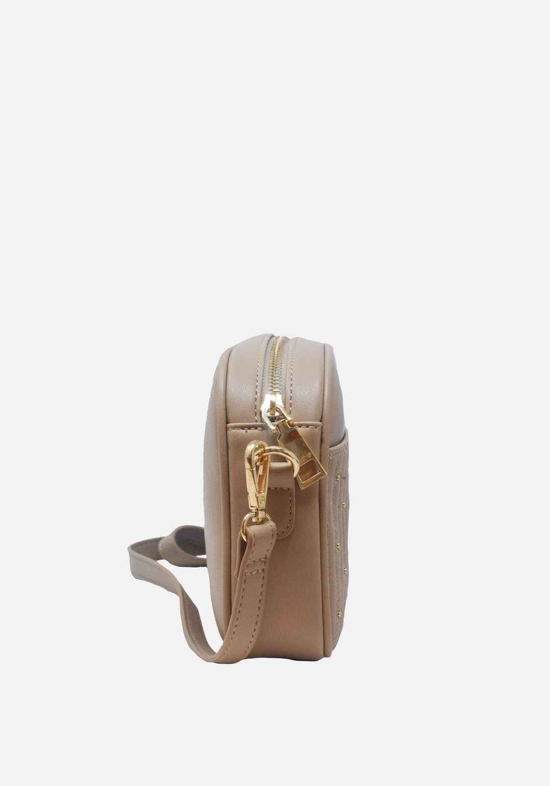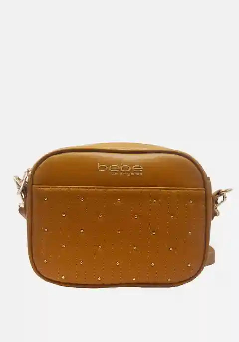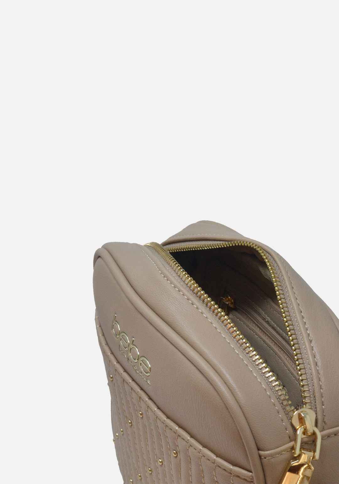 A signature Bebe logo is featured at the front of this compact camera crossbody bag with a top zipper, quilted design, and gold accent studs. Lamby Polyurethane Spot clean Imported | Bebe Women's Aliah Camera Crossbody in Beige Polyurethane