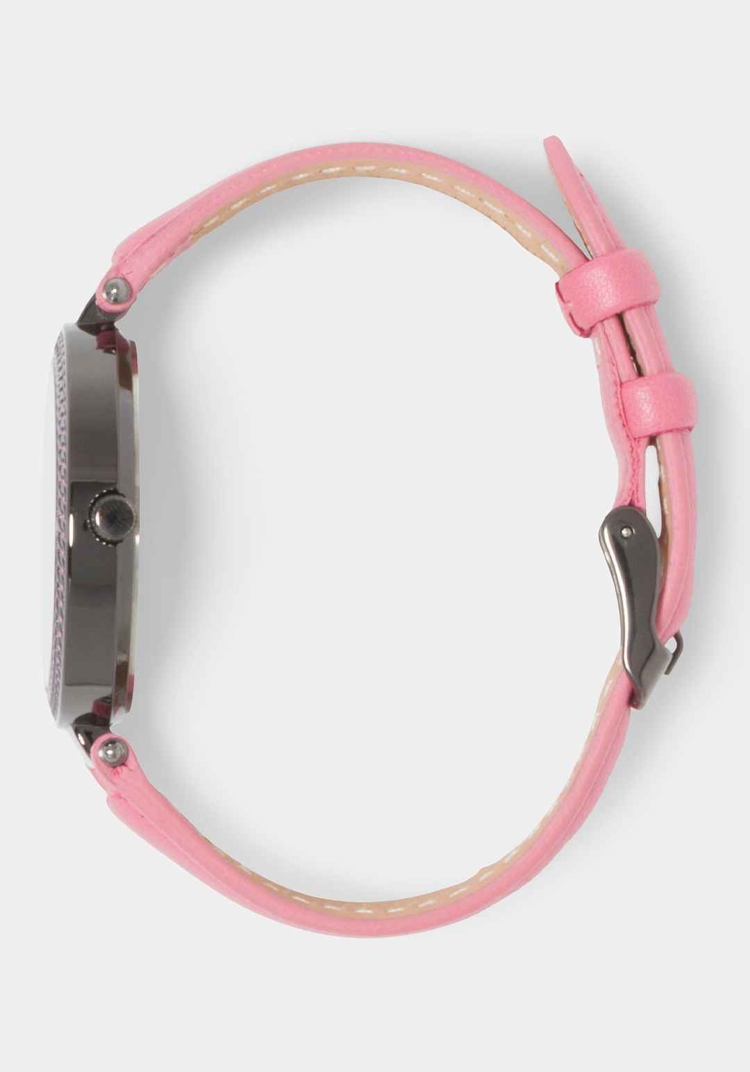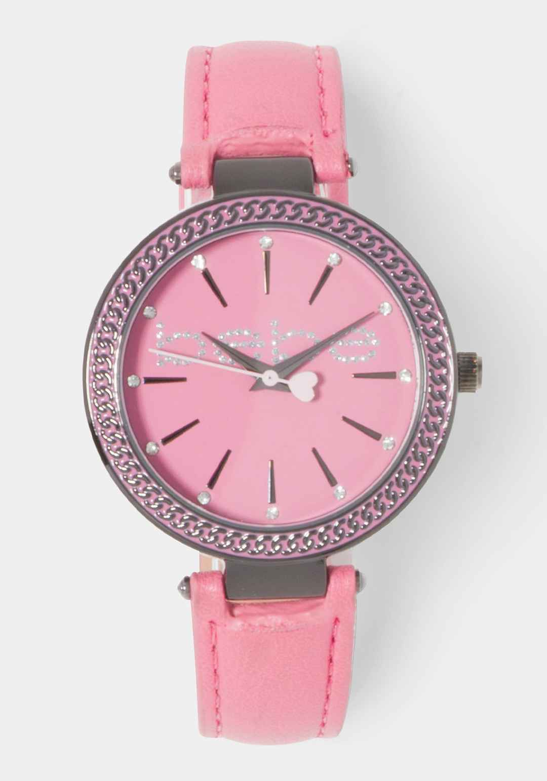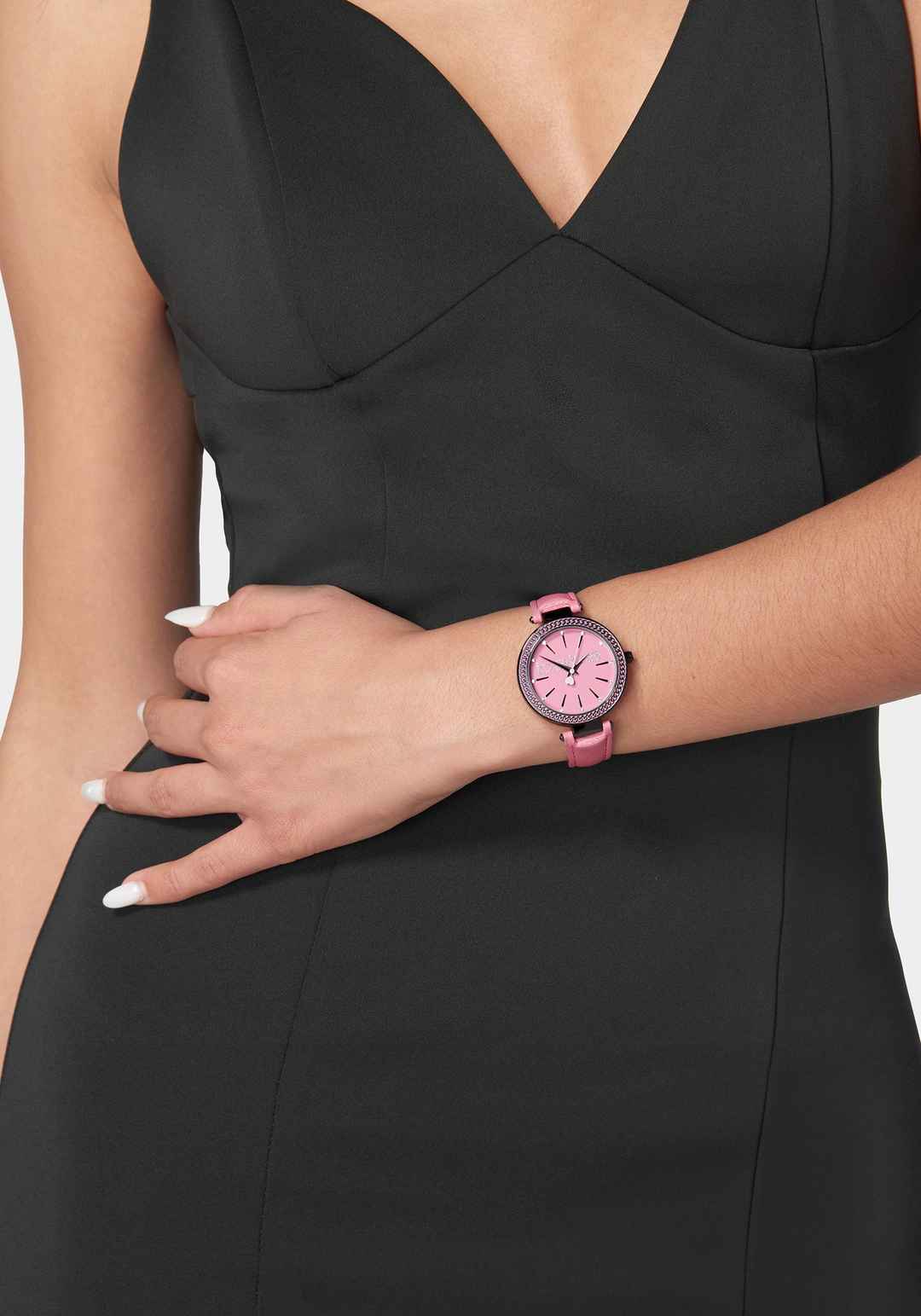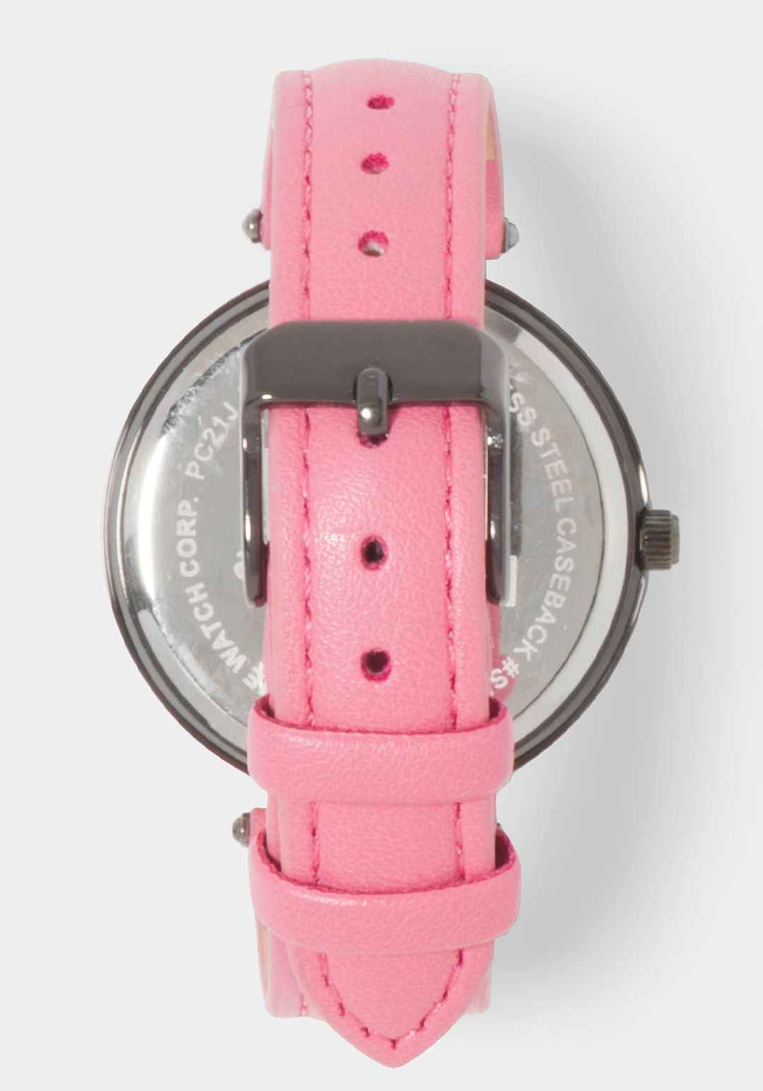 The hot pink strap watch is a statement of vibrant sophistication. The dazzling crystal bezel catches the light and eyes, while the hot pink strap adds a pop of color to your wrist. PU Strap; Alloy Case Stainless Steel Case back and Buckle; China Crystals Spot clean. Not water resistant. Imported | ...more