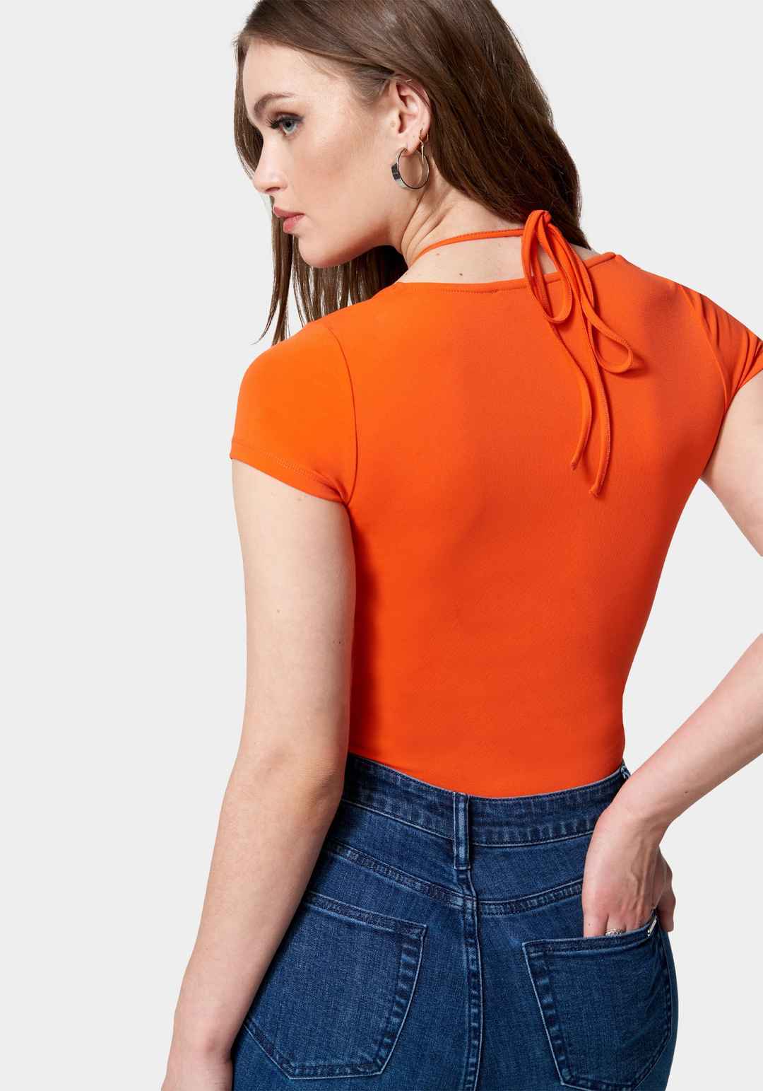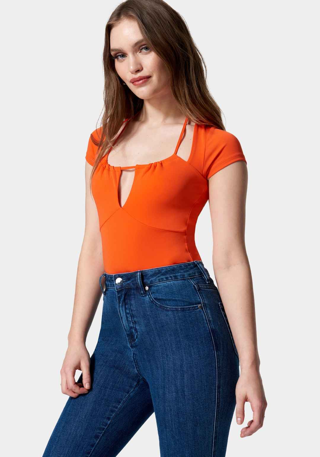 Cute top alert. A ruched self-tie neckline and center cutout make this short sleeve top an easy favorite for all your denim and skirts. 98% Polyester, 5% Spandex Hand Wash, Hang To Dry Imported 22"Length | Bebe Women's Short Sleeve Tie Ruched Neck Knit Top, Size XL in Cherry Tomato Spandex