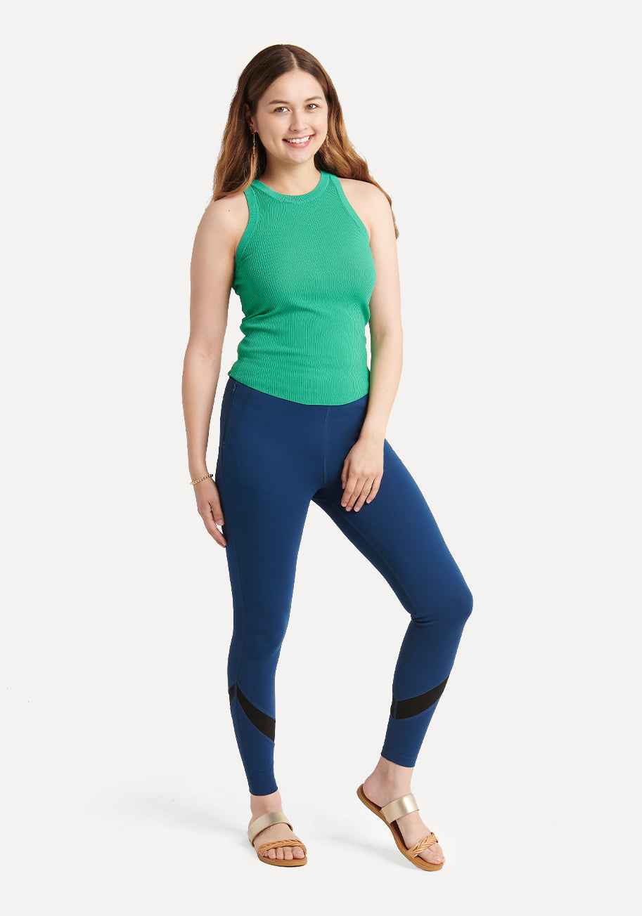 Wrinkle-resistant lightweight ponte fabric with 4-way stretch (blue). 10.5-inch front rise, 14-inch back rise, 7.75-inch leg opening (size small). Two front zippered pockets, one back hidden waist seam pocket. 2-inch encased waistband. Contrast panel detail. Machine washable. High-rise, cropped legg...more