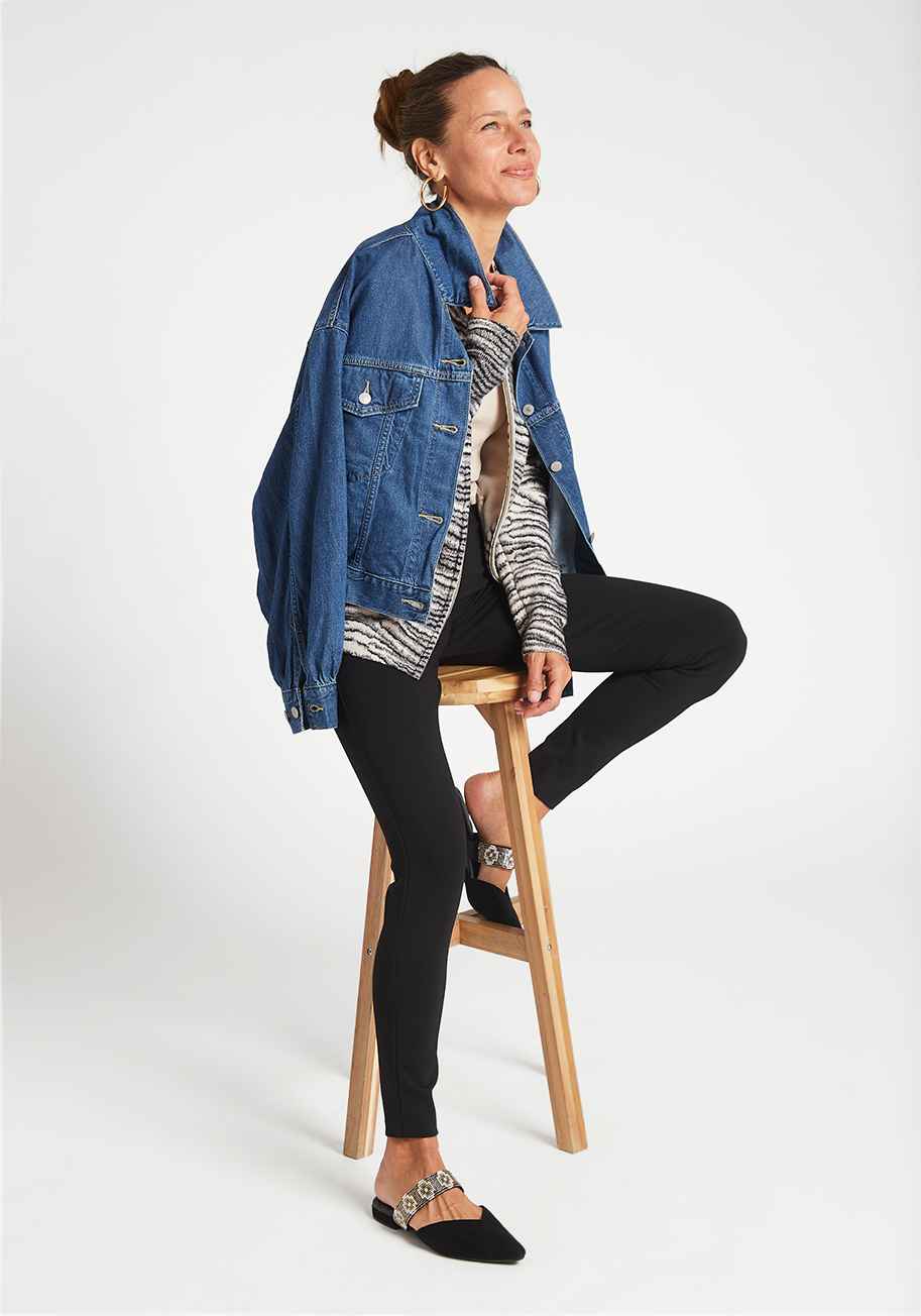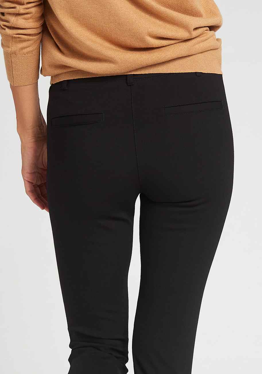 Wrinkle-resistant ponte fabric with 4-way stretch. 9-inch front rise, 12.5-inch back rise (size small). 9-inch leg opening. Faux pockets. Non-functional button and faux fly. 1.5-inch elastic waistband with belt loops. Inseam lengths: Extra Short 22", Short Petite 24", Petite 26", Regular 28", Long 3...more