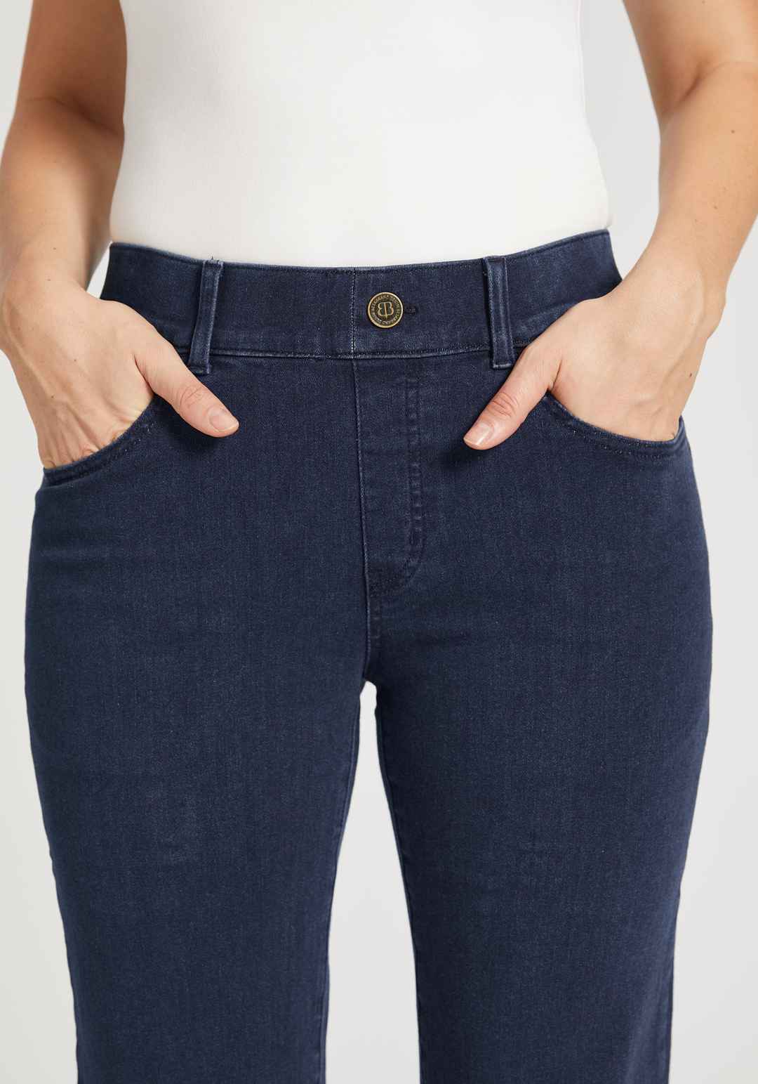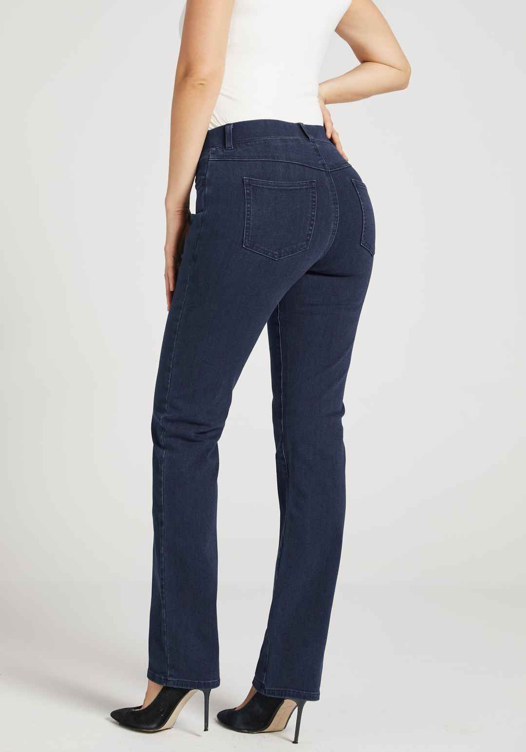 Premium denim with 4-way stretch. 9-inch front rise, 13-inch back rise, 15-inch leg opening (size small). Extended Sizes: 12-inch front rise, 19-inch back rise, 18-inch leg opening (size 2X). Four functional pockets. Non-functional button and faux fly. 1-inch elastic waistband with belt loops. Exten...more