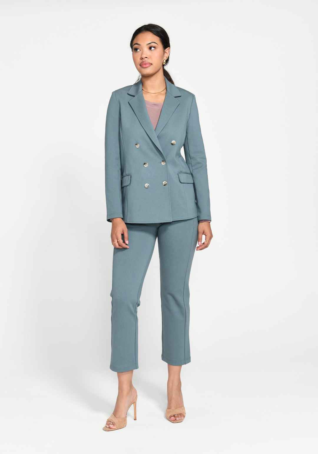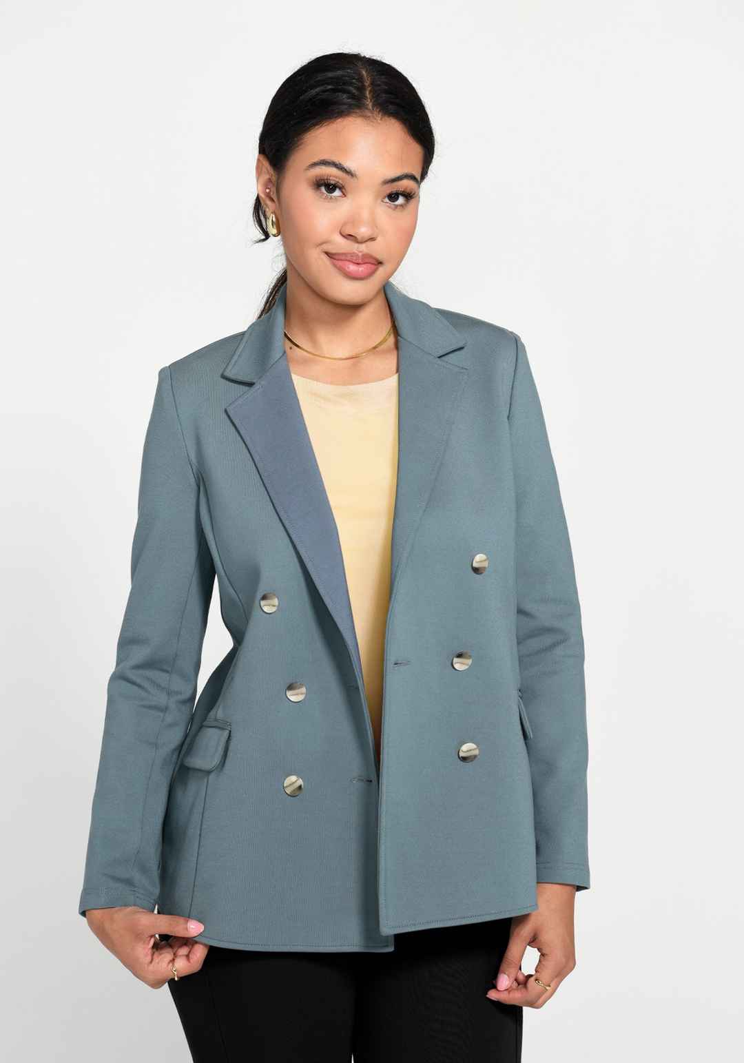 Breeze through your workday in the Double-Breasted Blazer, where fashion meets function. Enjoy the comfort of 4-way stretch fabric, the convenience of wrinkle resistance, and the utility of two pockets. Of course, they match back perfectly to your favorite Dress Pant Yoga Pants. Relaxed, boxy fit th...more