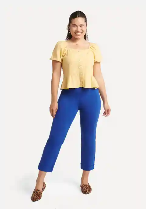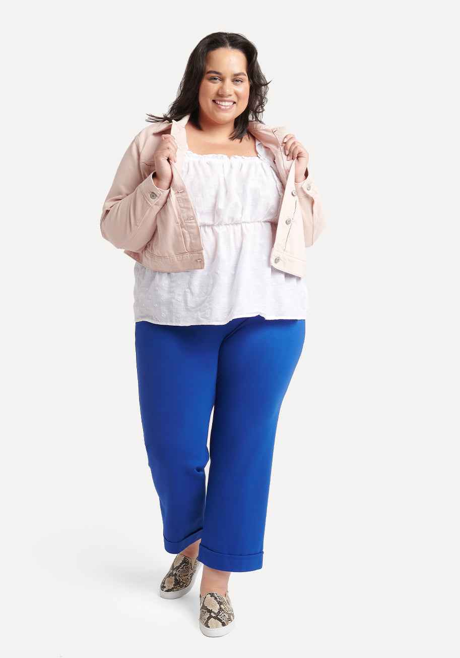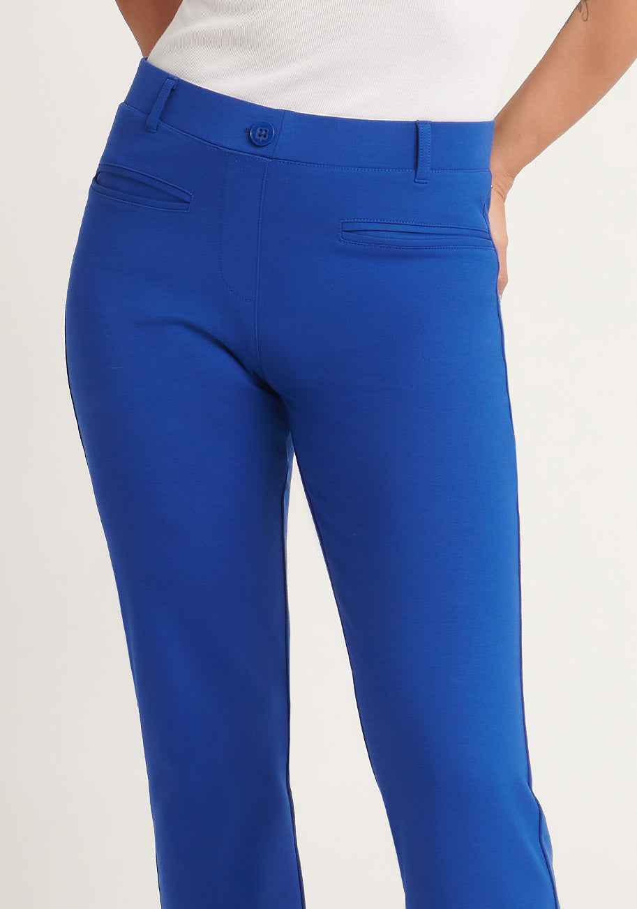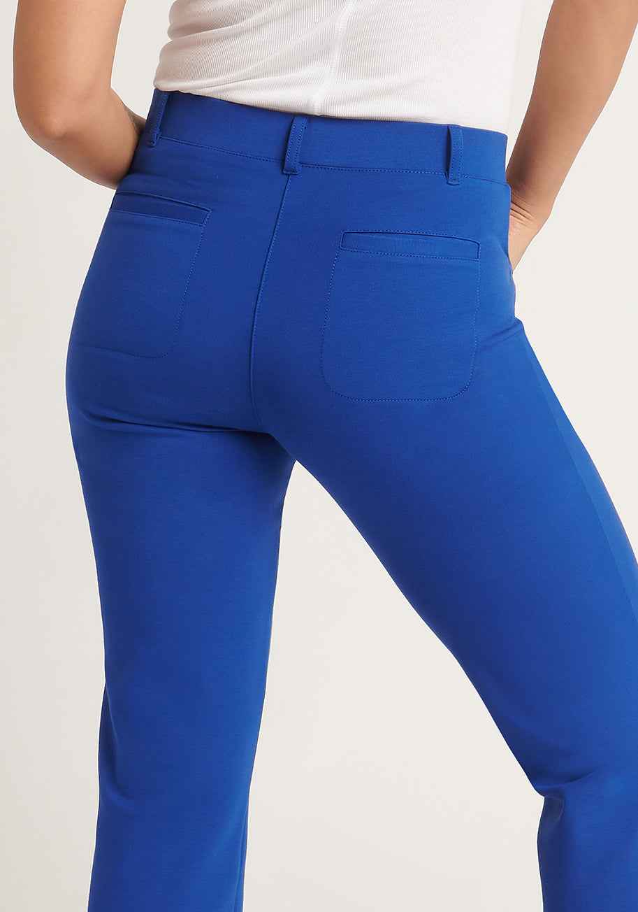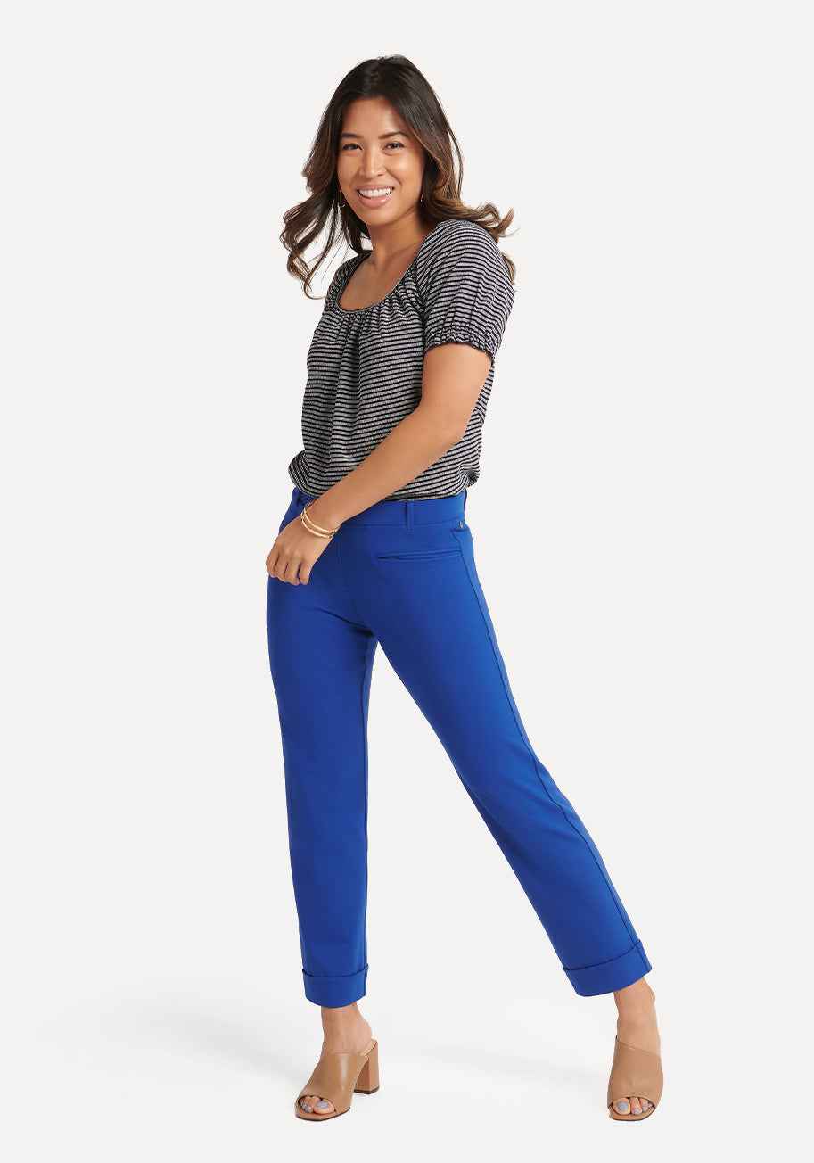 Wrinkle-resistant lightweight ponte with 4-way stretch (blue). 9.75-inch front rise, 14-inch back rise (size small). 15-inch leg opening. Extended Sizes: 12.25-inch front rise, 18.75-inch back rise (size 2X). Extended Sizes: 19-inch leg opening. Four functional pockets. Faux fly with decorative butt...more