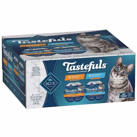 Blue Tastefuls Spoonless Singles wet cat food variety pack features tasty chicken or turkey as the first ingredient in silky-smooth pats with brown rice and sweet potatoes. Our handy variety pack gives you portions that are just right for one meal, so no more storing open cat food in the fridge. And...more