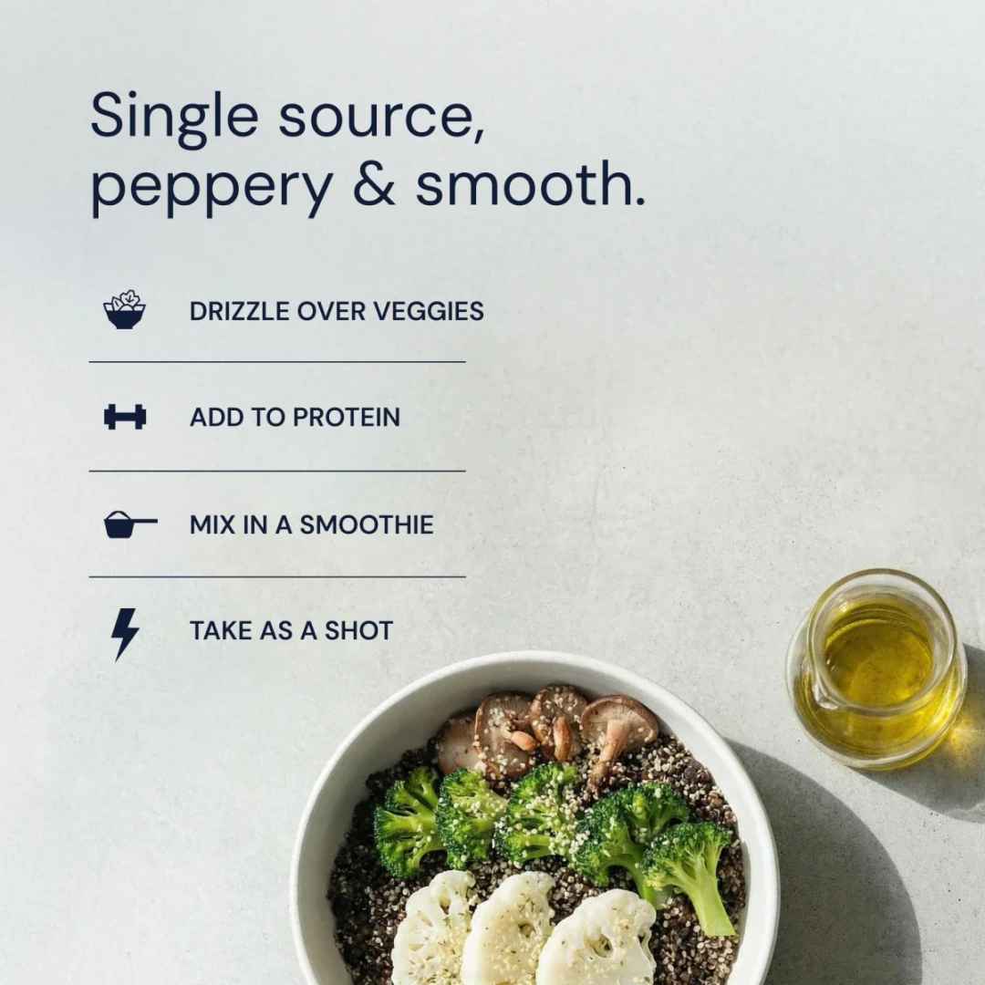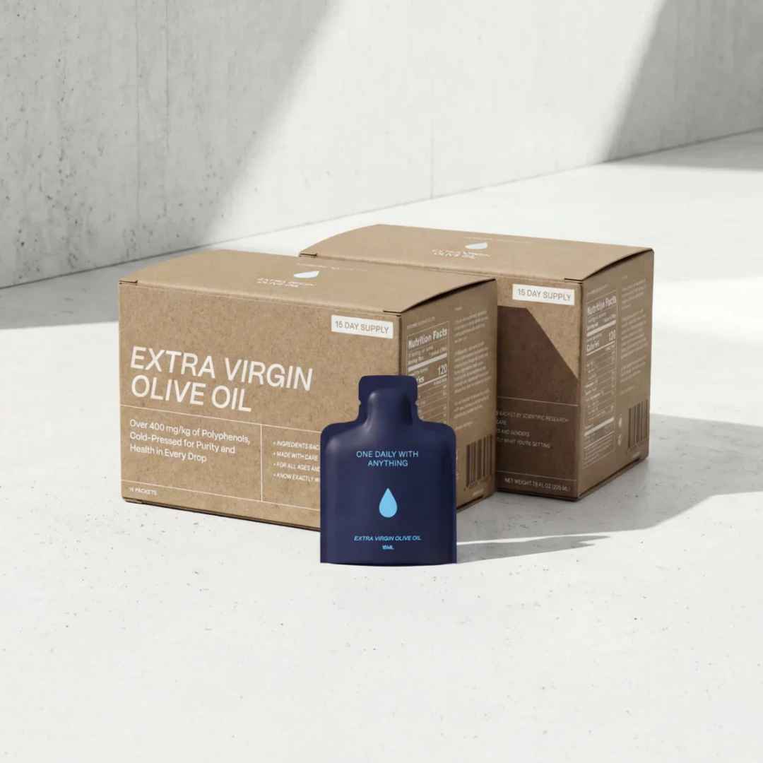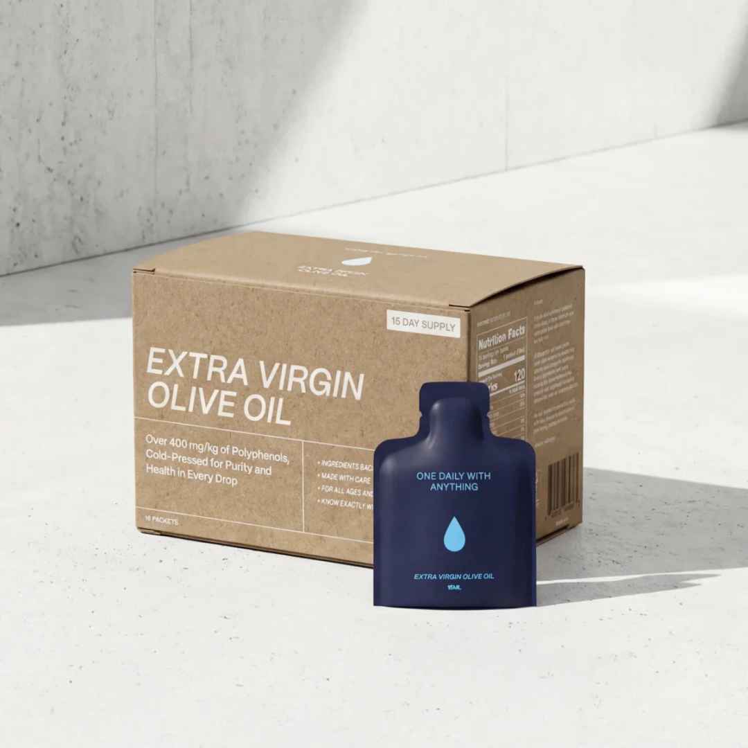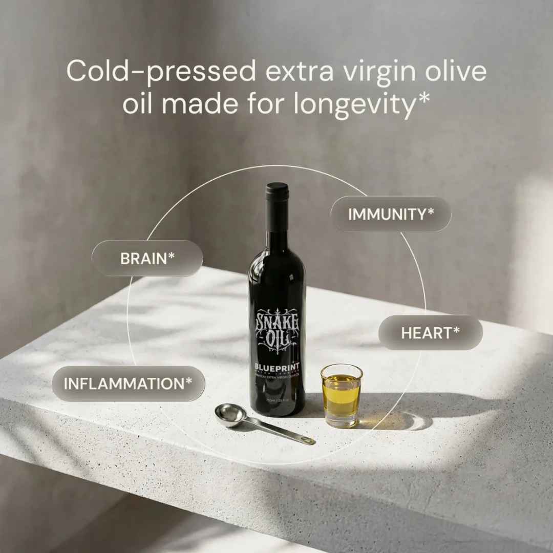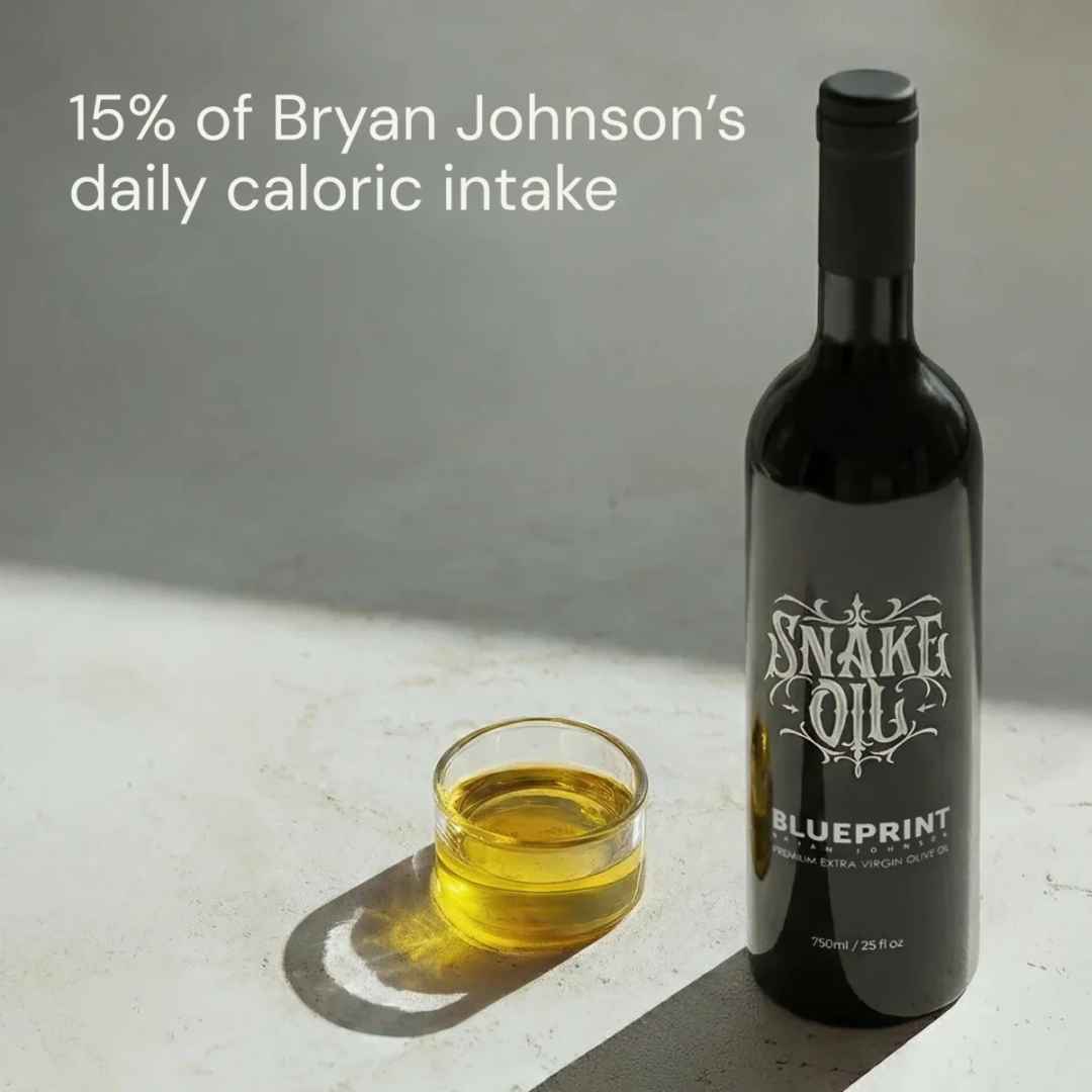 15% of Bryan’s caloric intake. This “Snake Oil” is cold-pressed extra virgin olive oil made for longevity with 400mg polyphenols. Single source, peppery & smooth.