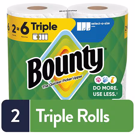 Bounty Paper Towels are 2x more absorbent, so you can clean up messes quicker and use less than the leading ordinary brand. Each sheet has a Durable Diamond Texture to tackle anything from everyday spills to tough projects throughout your home. A variety of pack and rolls sizes are available, and go...more