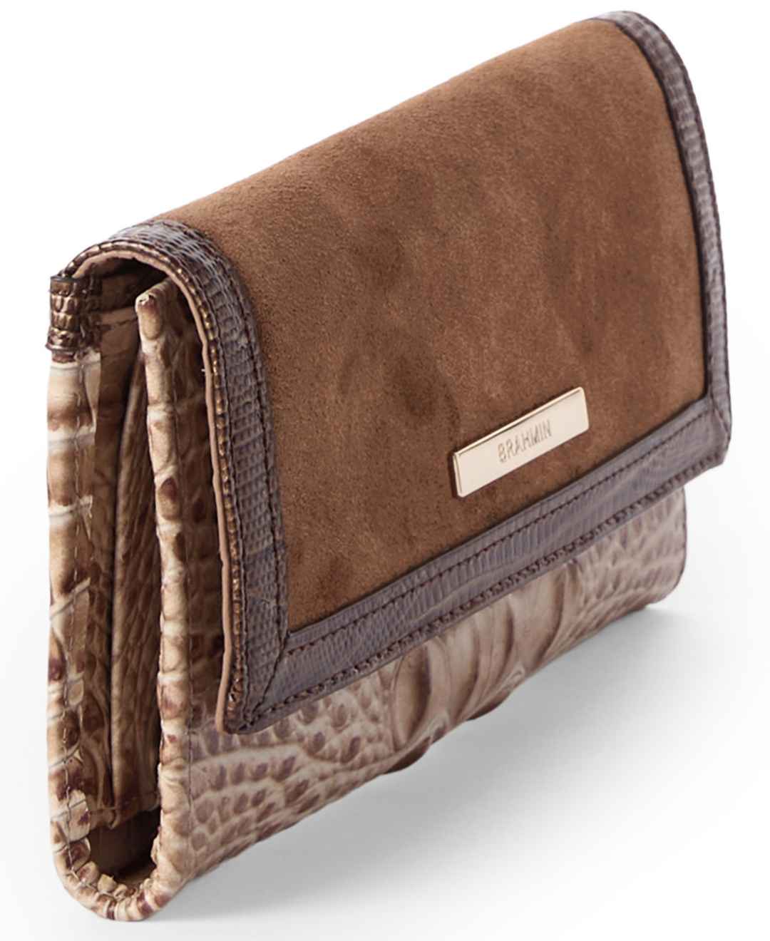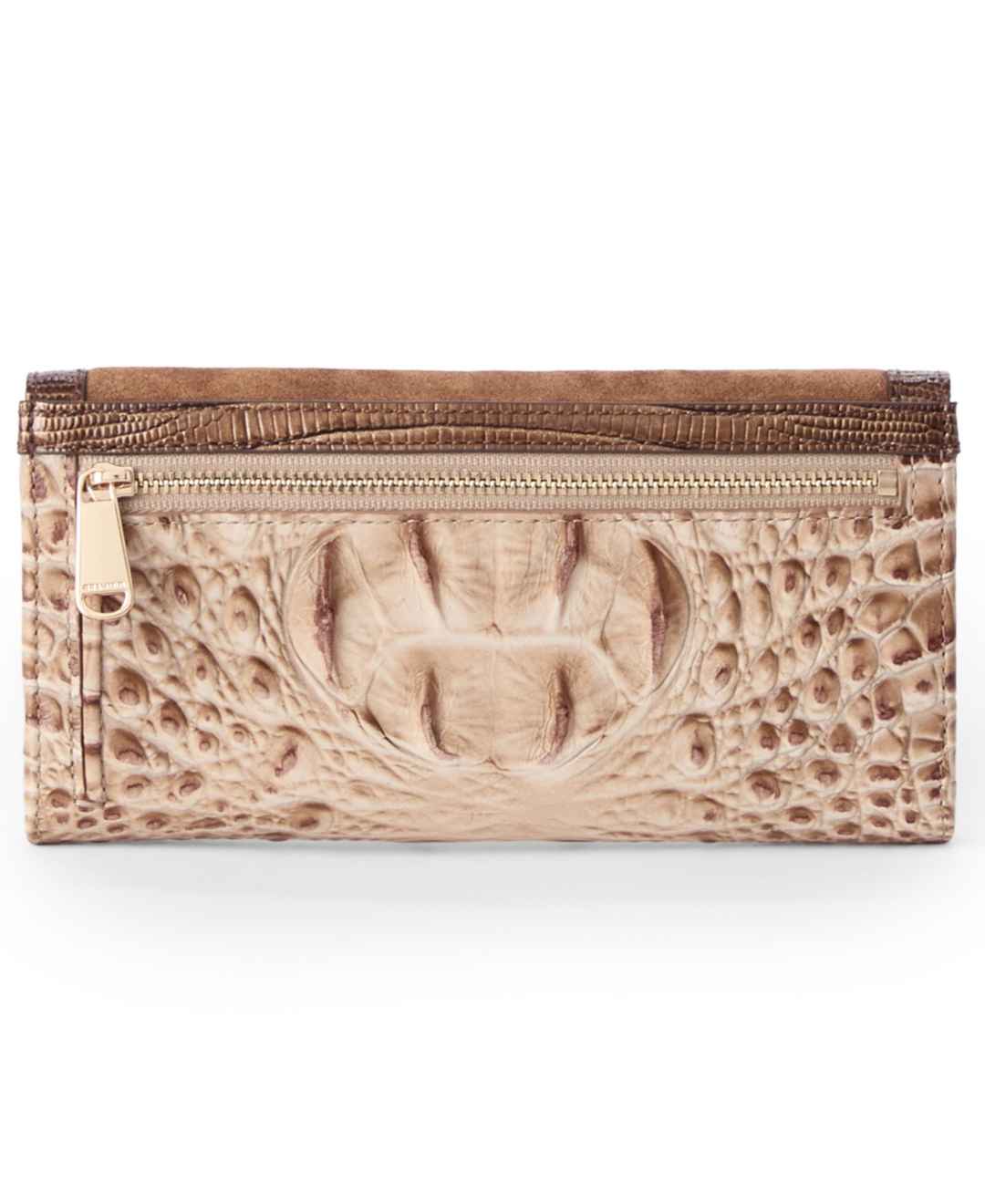 Keeping your essentials easily organized, this Brahmin wallet offers a trifold interior with multiple credit card slots and a back zip pocket. This design allows you to store cash, cards, and more in one accessible place.