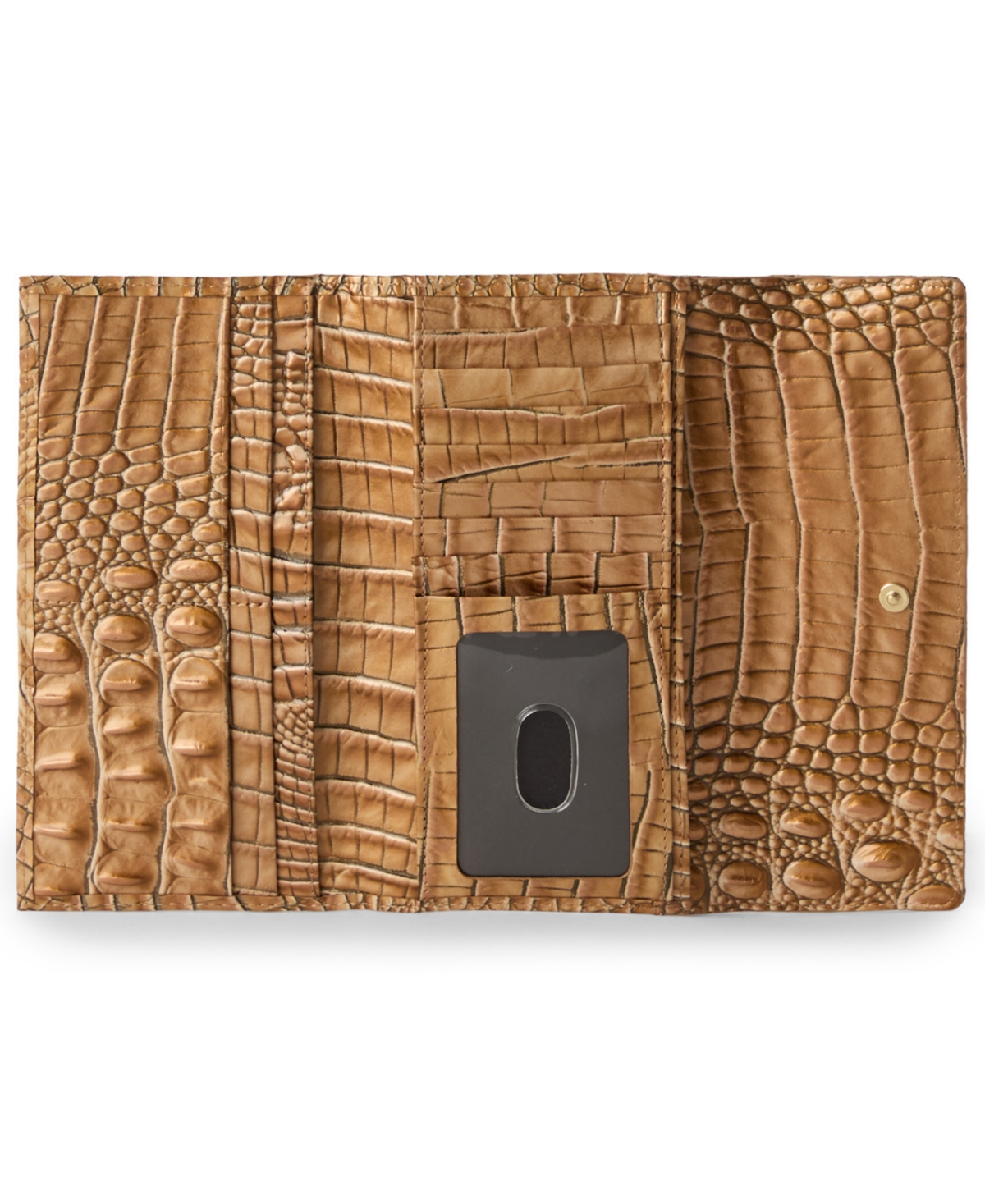 Stay effortlessly organized with this Brahmin wallet, designed with a trifold interior, multiple card slots, and a back zip pocket to neatly store cash, cards, and checkbooks. A snap closure provides secure access, while the sleek leather body maintains a polished finish.