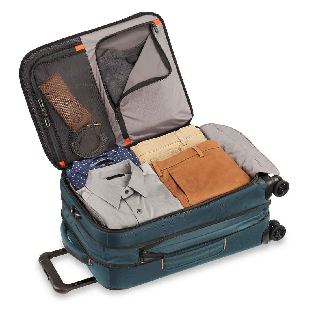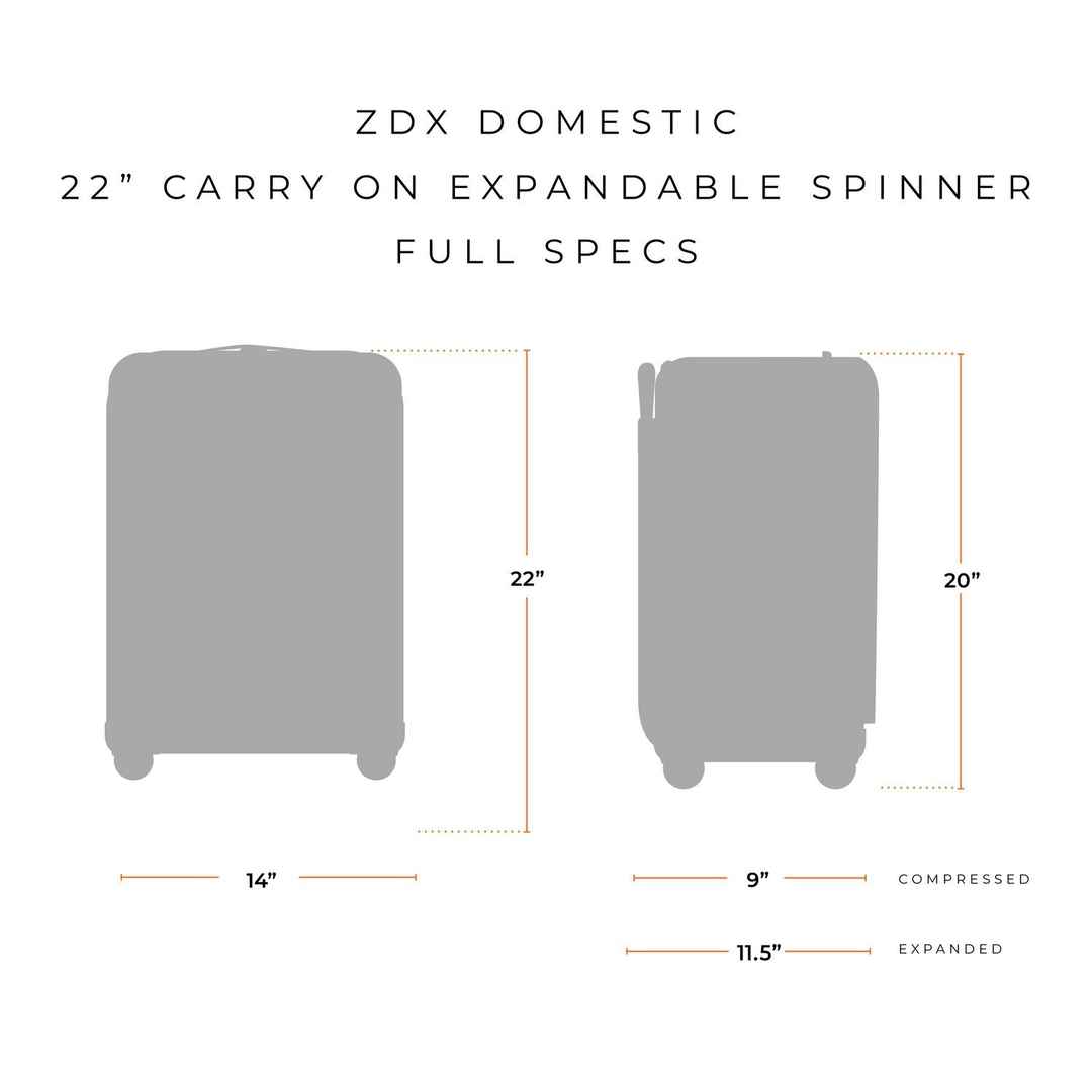 The ZDX 22 Domestic Carry-On Expandable Spinner offers 2.5 of expansion depth and still fits in an overhead compartment, making the difference between having to check a bag or notand saving time and money. Features such as an outside battery pocket so you can keep charging your phone, our Smartlink ...more