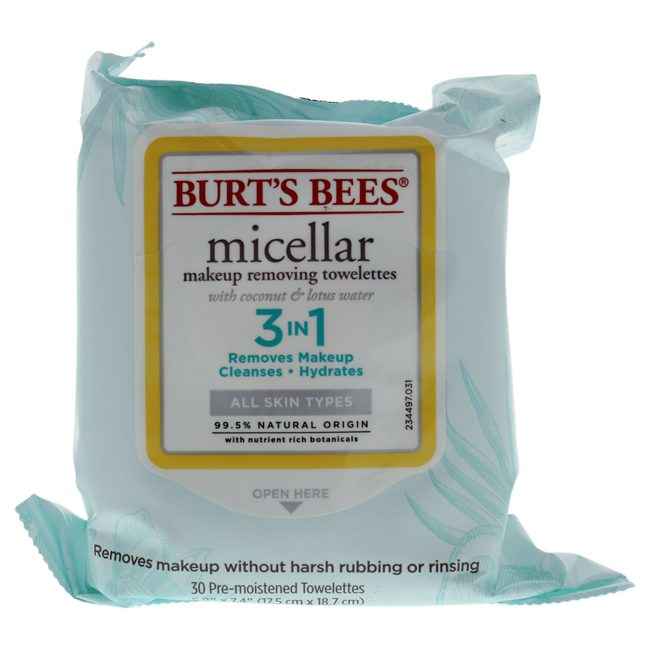 Burtu2019s Bees' Micellar Makeup Removing Towelettes easily remove dirt and makeup while cleansing and moisturizing the skin. Featuring gentle coconut and lotus water, this 99.5% natural formula mercilessly tackles impurities while remaining gentle to the skin.Enjoy that fresh-faced feel whenever an...more