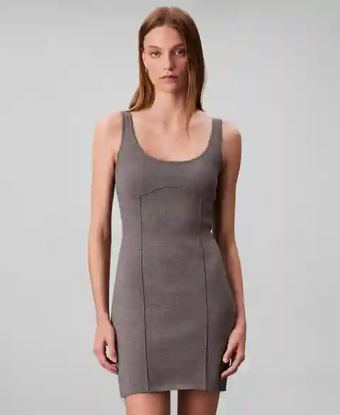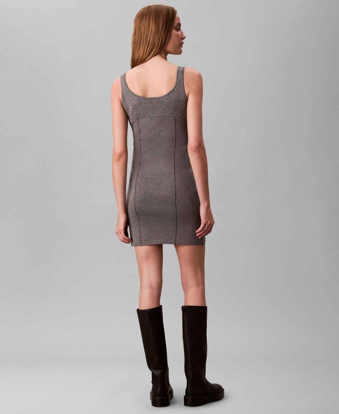 Embrace this Calvin Klein Half Milano tech knit mini dress with a scoop neck, providing structured support and a sleek fit. Designed sleeveless with a slim silhouette, it ensures ease of movement and enduring comfort.