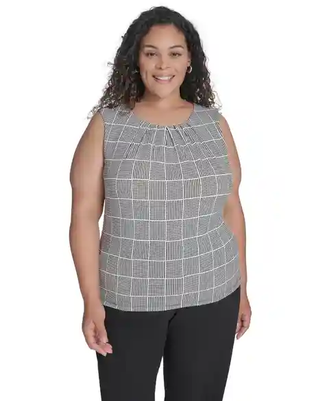 Stylish pleats at the neckline provide added coverage in this plus size top from Calvin Klein, a sleeveless pick that adds endless versatility to your career collection.