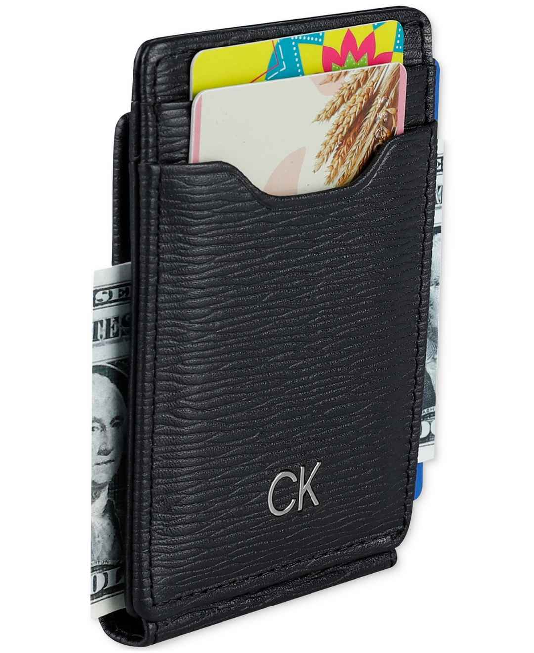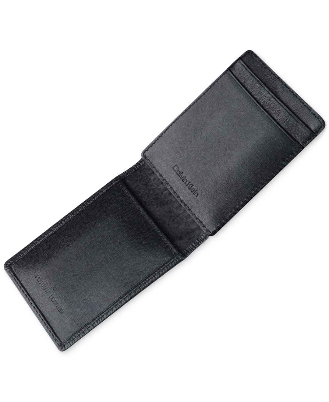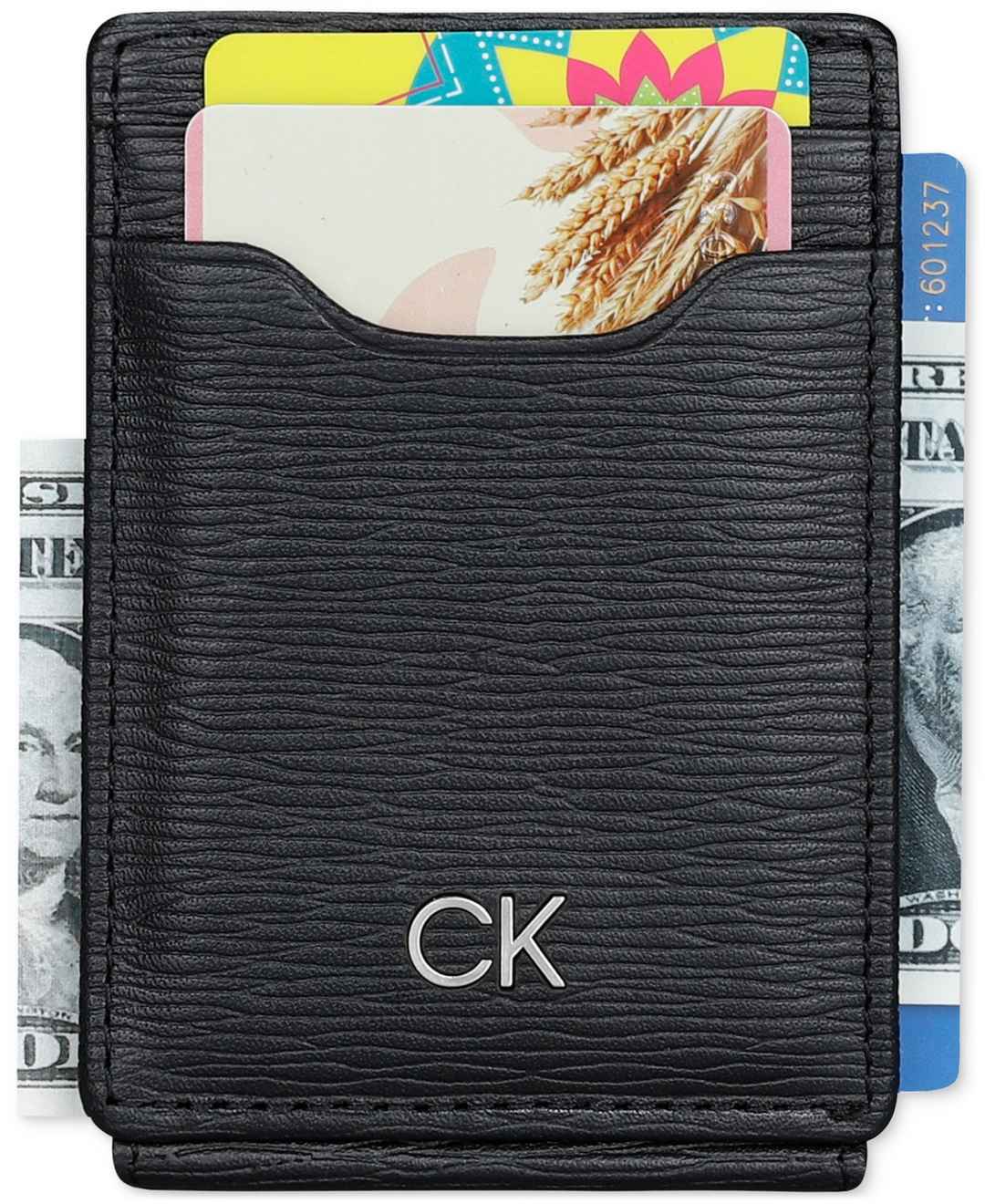 Protect your valuables with understated, all-black elegance when you entrust your cards and cash to this textured pebble wallet from Calvin Klein.
