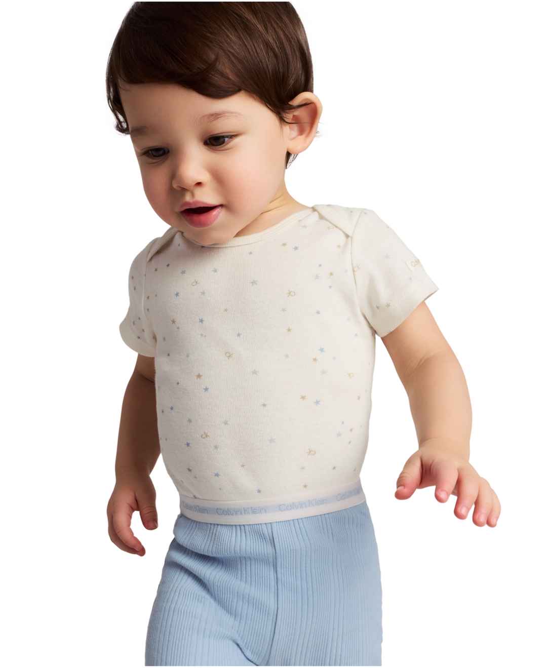 This multi-pack of short sleeve bodysuits from Calvin Klein is soft comfort. Featuring overlap shoulders and snap inseam for easy changing.