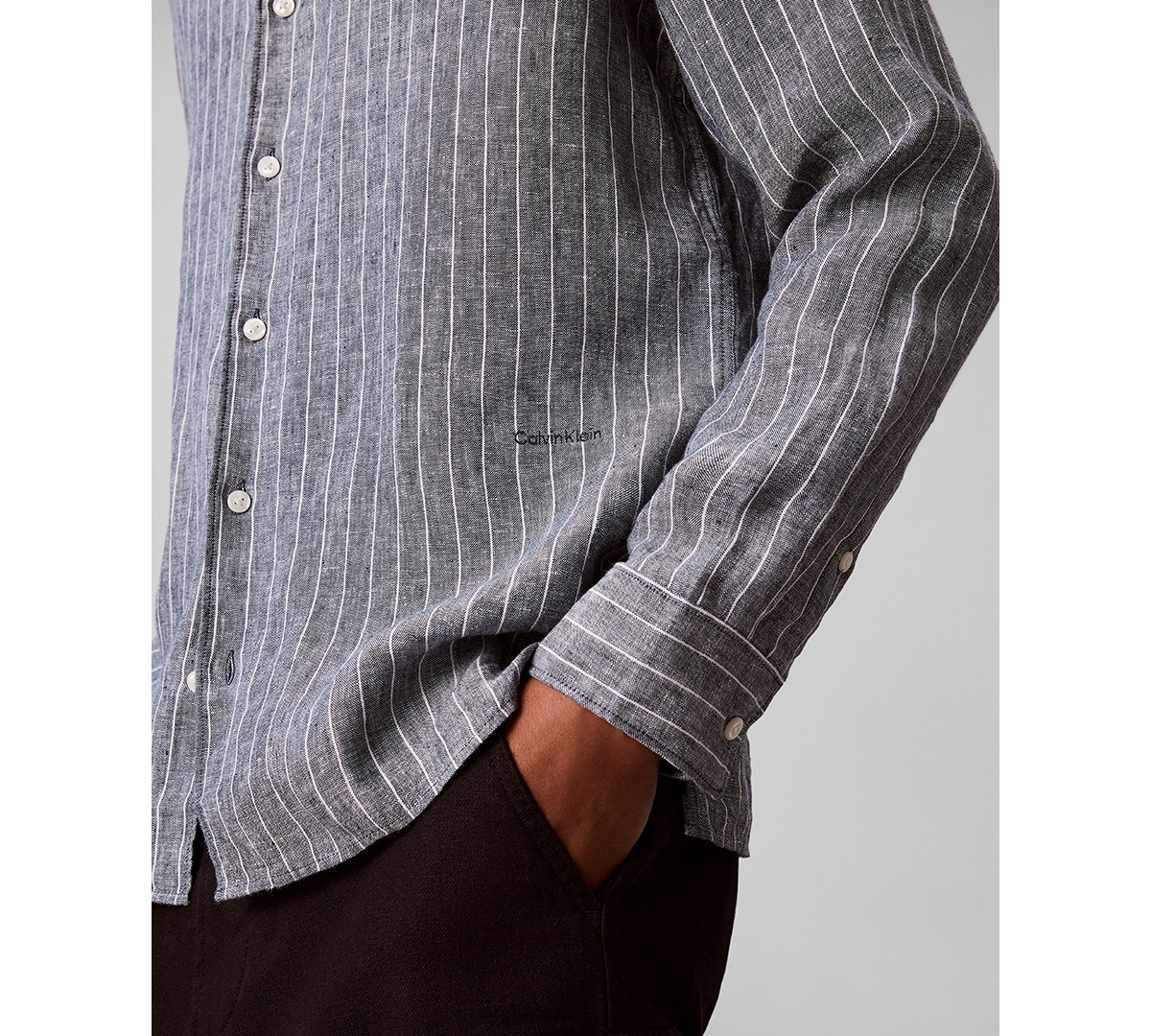 Crafted from lightweight linen fabric, this Calvin Klein button-down shirt is cut in a classic fit. Made with fine vertical pinstripes and an embroidered Calvin Klein logo at the middle side.