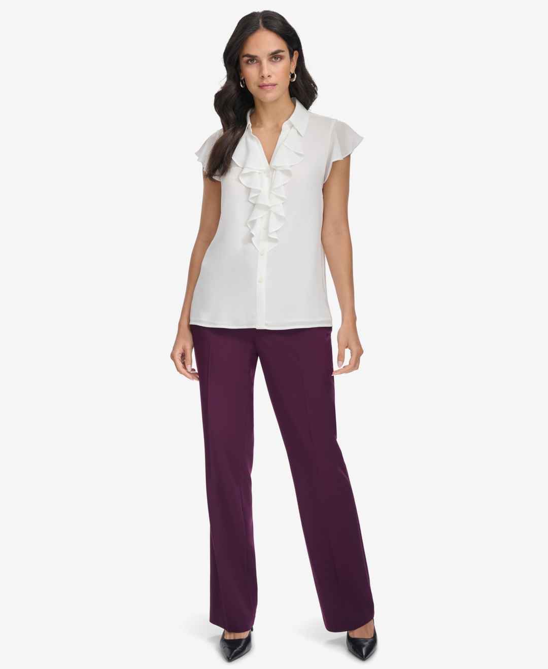 Elegant ruffles line the front of this office-ready blouse by Calvin Klein.