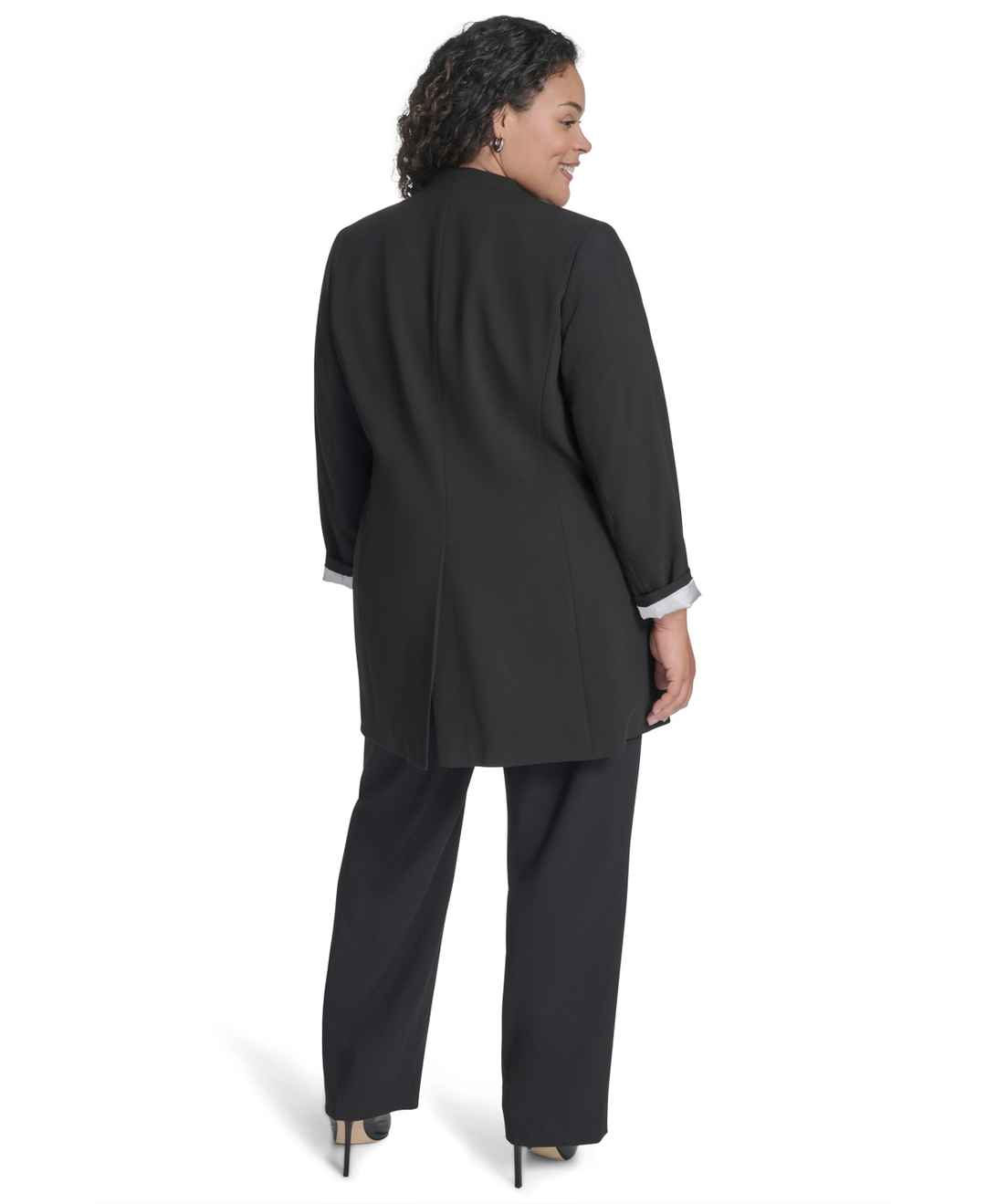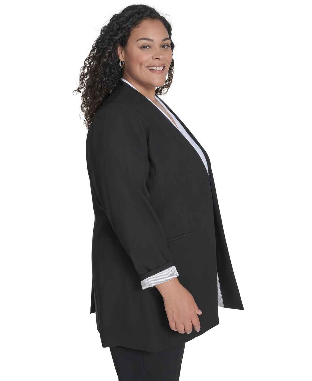 An elongated silhouette creates a polished, contemporary feel with this plus size collarless blazer from Calvin Klein.