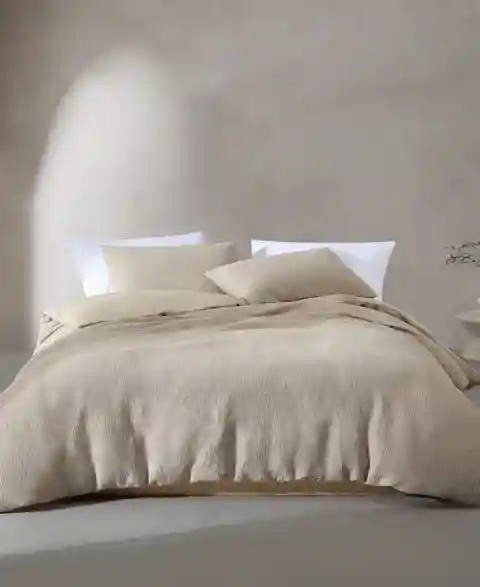 The Calvin Klein Microwaffle Melange Duvet Cover Set features a hidden button closure and inner corner ties.