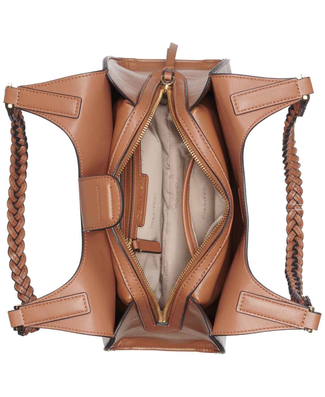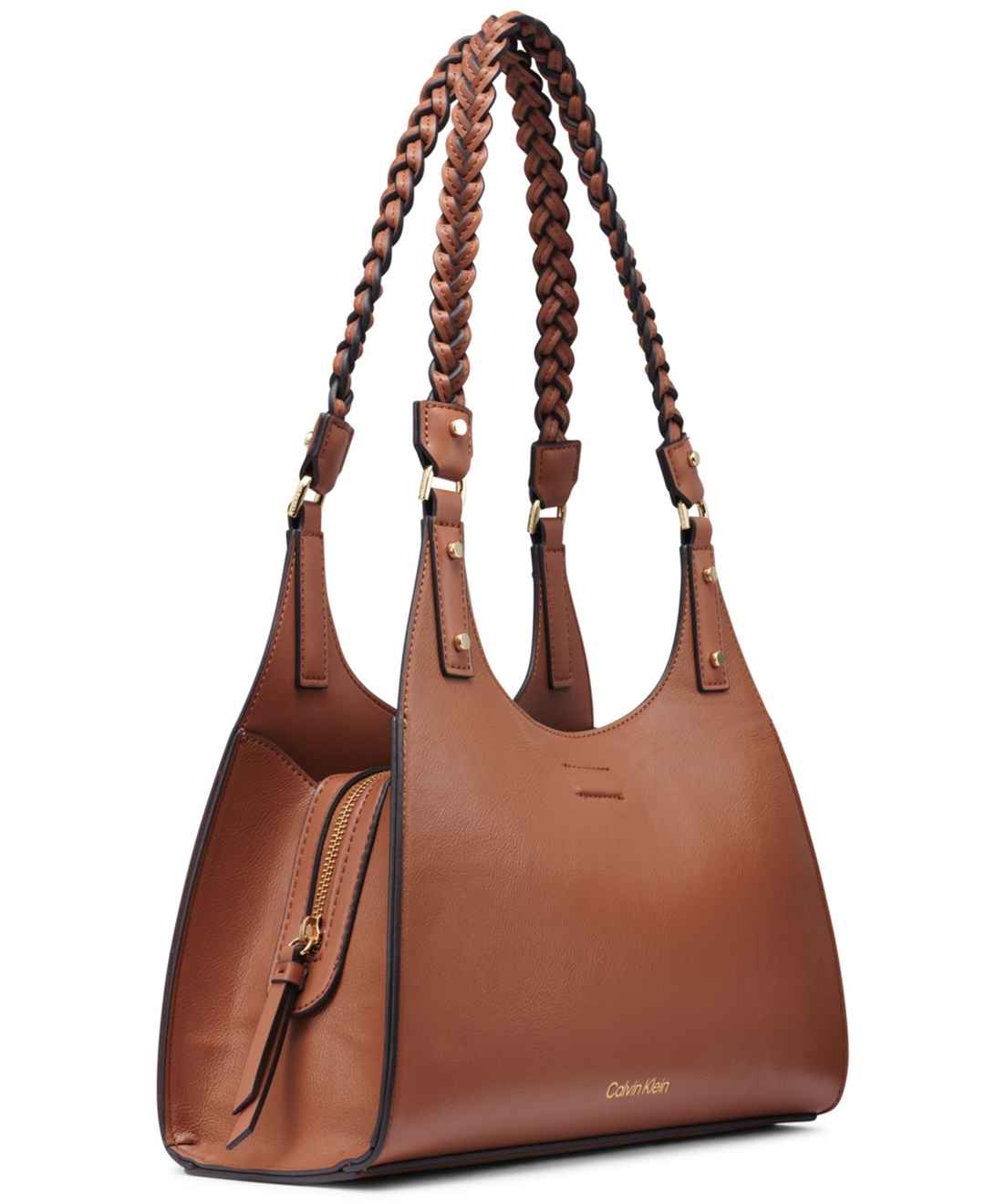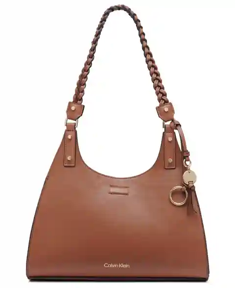 Available in a variety of colors and accented with braided straps and a logo medallion, this shoulder bag by Calvin Klein is perfectly sized with a variety of pockets a convenient zip closure.