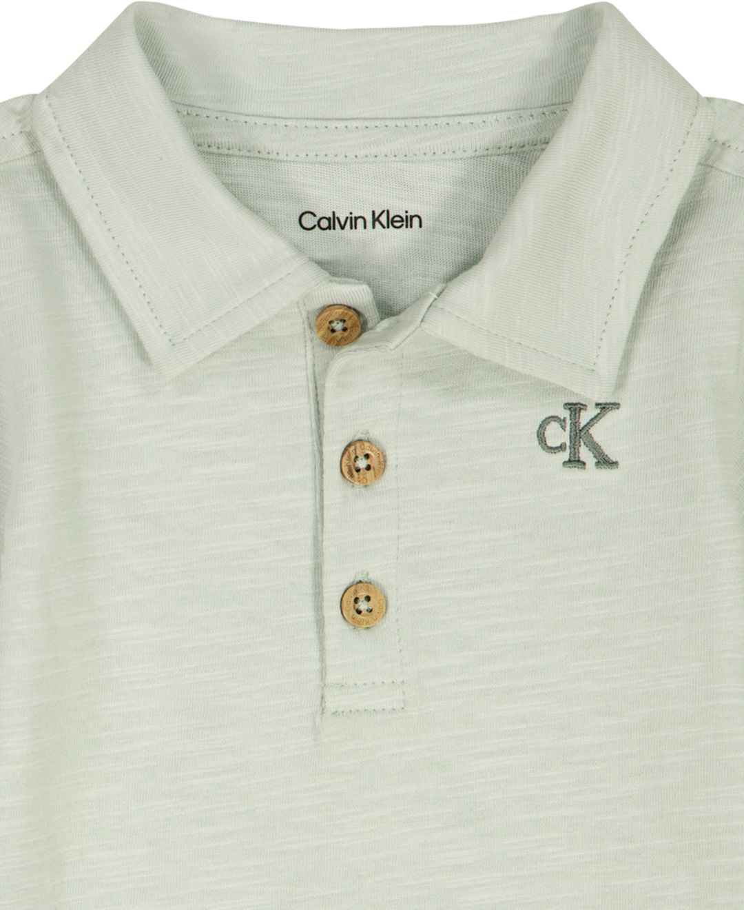 Spring outfitting from Calvin Klein features a polo bodysuit with woven denim shorts. Ultrasoft comfort meets casual style in this coordinated two-piece set. Embroidery details add a refined finish to the overall look.