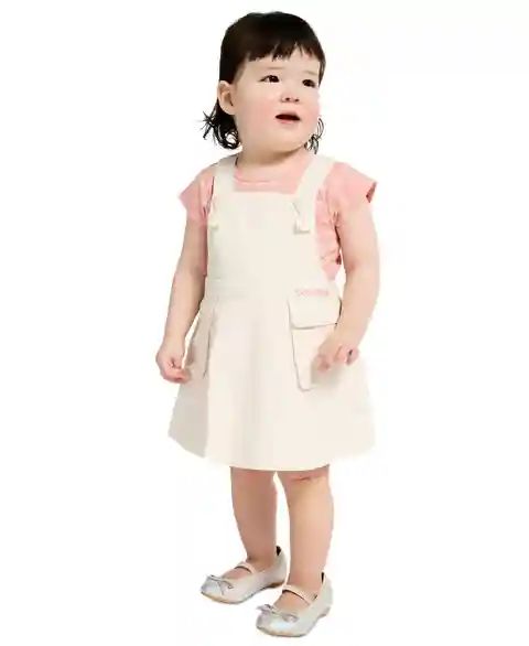 Home Calvin Klein Calvin Klein Baby Girls' Ribbed Printed Bodysuit & Denim Overall, 2-Piece Set - Light Cream/Soft Pink