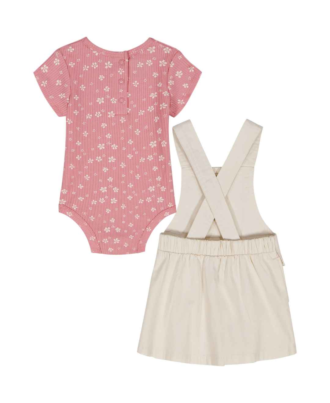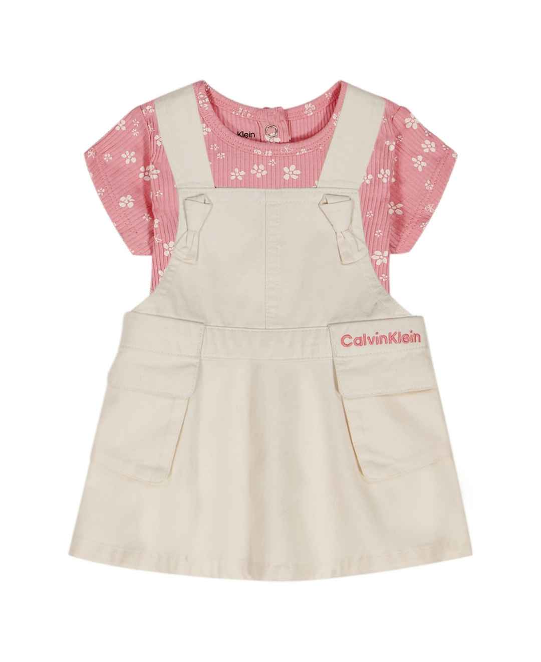Calvin Klein Baby Girls' Ribbed Printed Bodysuit & Denim Overall, 2-Piece Set - Light Cream/Soft Pink