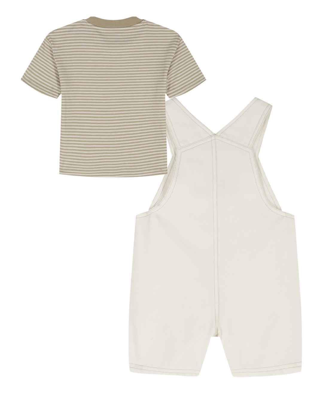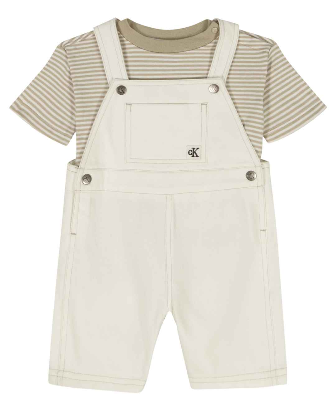 Modern and comfy, this Calvin Klein outfit pairs a classic crewneck top with coordinating shortalls for an easy, put-together look. The ribbed-trim top features short sleeves, a snap-top shoulder, and a tagless interior for comfort, while the shortalls are finished with button-front straps, side but...more