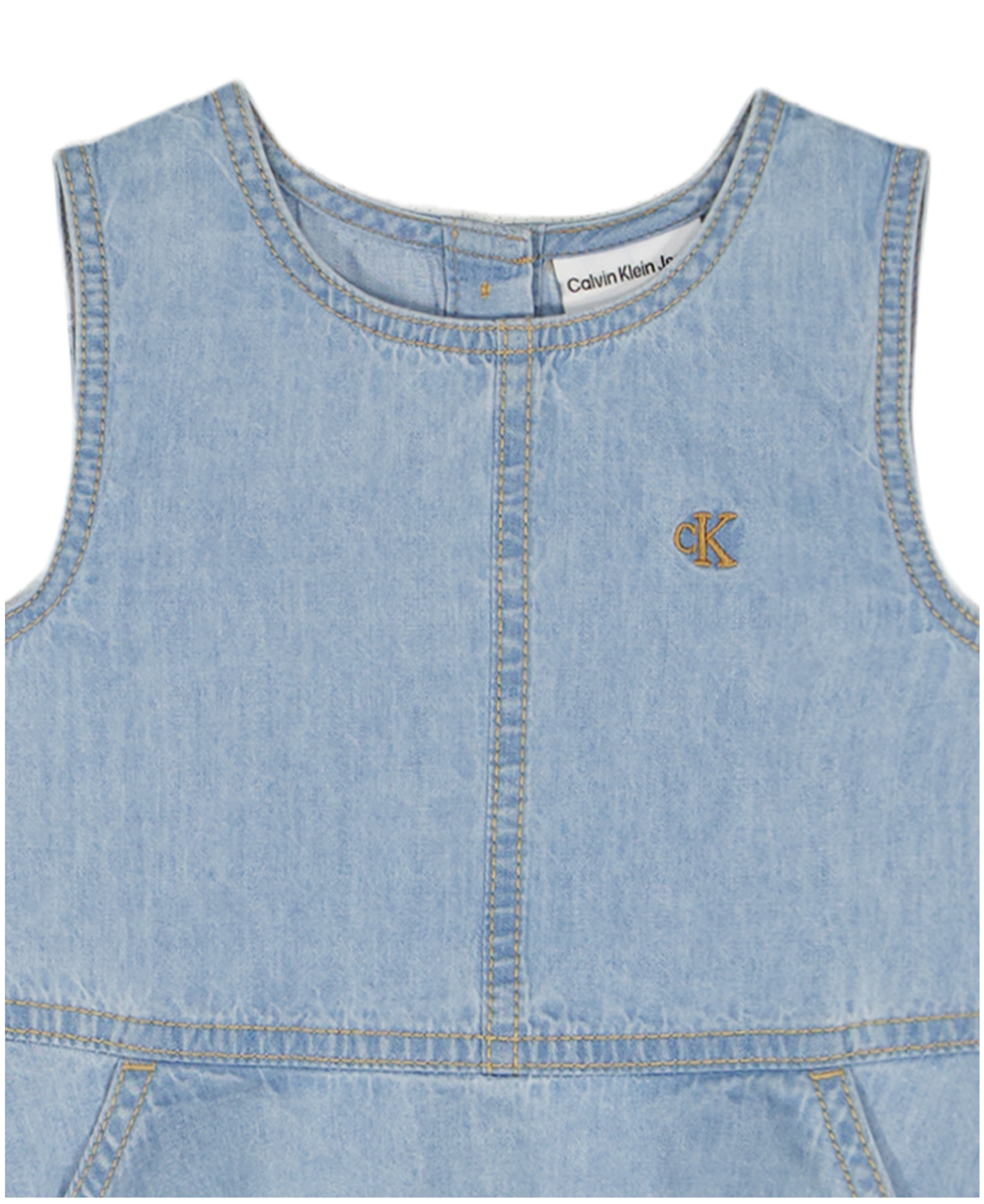 Keep it casual and cool with this Calvin Klein sleeveless denim dress, featuring a classic round neckline and back closure for easy wear. Subtle logo embroidery adds a stylish, signature touch to this versatile wardrobe staple.