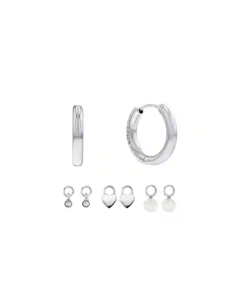 Versatile shapes. Huggie-style earrings paired with three sets of charms in distinct styles.