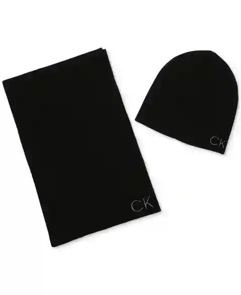 Cold weather hits and you want to be comfortable? No problem. Reach for this acrylic scarf and beanie set by Calvin Klein.