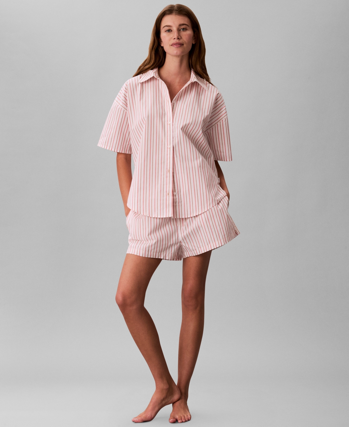 Breezy summer comfort meets classic design in these Calvin Klein striped pajama shorts, crafted from a crisp, breathable fabric. A full-encased elastic waistband with cotton gusset, faux fly stitching, and side vents ensures an easy, tailored fit.