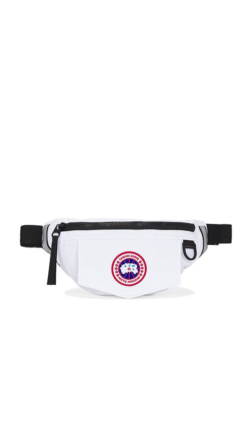 Canada Goose Waist Pack in White. Canada Goose Waist Pack in White. Gabardine exterior and ripstop lining. Top zip closure. One main compartment. Front exterior pouch with foldover closure Back exterior zip pocket. One interior slip pocket. Adjustable strap for all-day comfort, features embossed Can...more