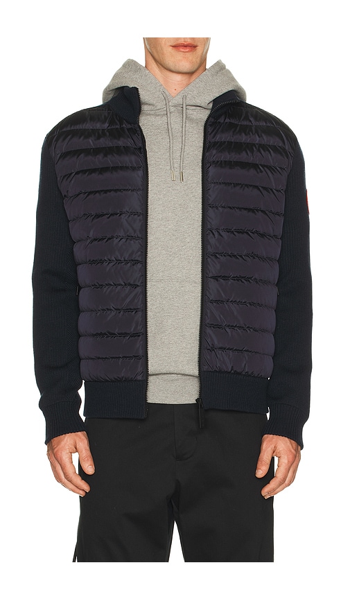 Canada Goose Hybridge Knit Jacket in Navy. - size XL/1X (also in XXL/2X) Canada Goose Hybridge Knit Jacket in Navy. - size XL/1X (also in XXL/2X) Self 1: 100% wool Self 2: 100% polyamide. Dry clean only. Front zip closure. Side zip pockets. Logo patch on sleeve. Lightweight padded ripstop front pane...more