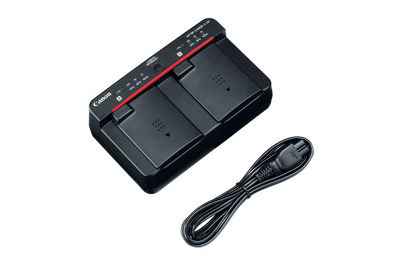 Two battery packs can be attached. It takes about 170 minutes to charge one LP-E19 battery pack (14 minutes for LP-E4 or LP-E4N). It plugs directly into AC outlets. Not compatible with the Car Battery Cable CB-570.