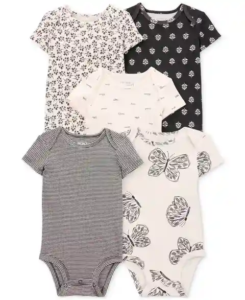 Stock up and save with this adorable five-pack of cotton bodysuits from Carter's, complete with overlap shoulders for easy over the head and strong snaps at the legs for easy changes.